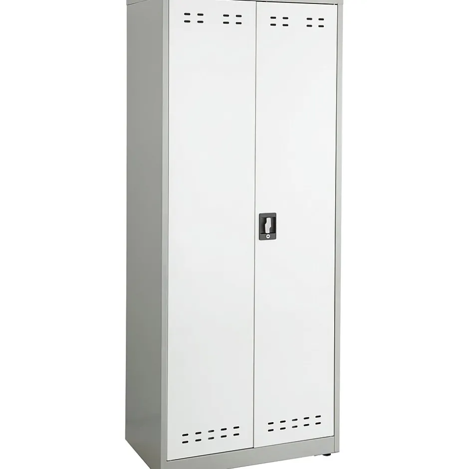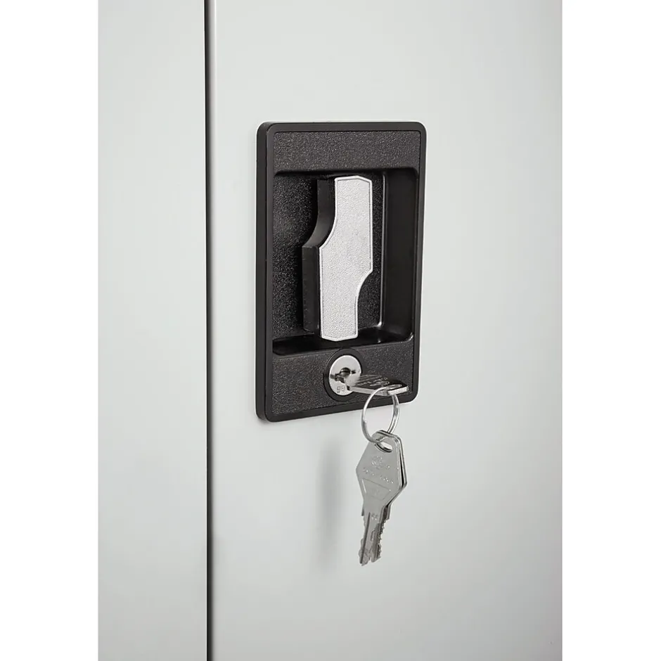 - The cabinet features a recessed locking door handle, with a three-point locking design and adjustable leveling glides to ensure there isn’t any wobbling