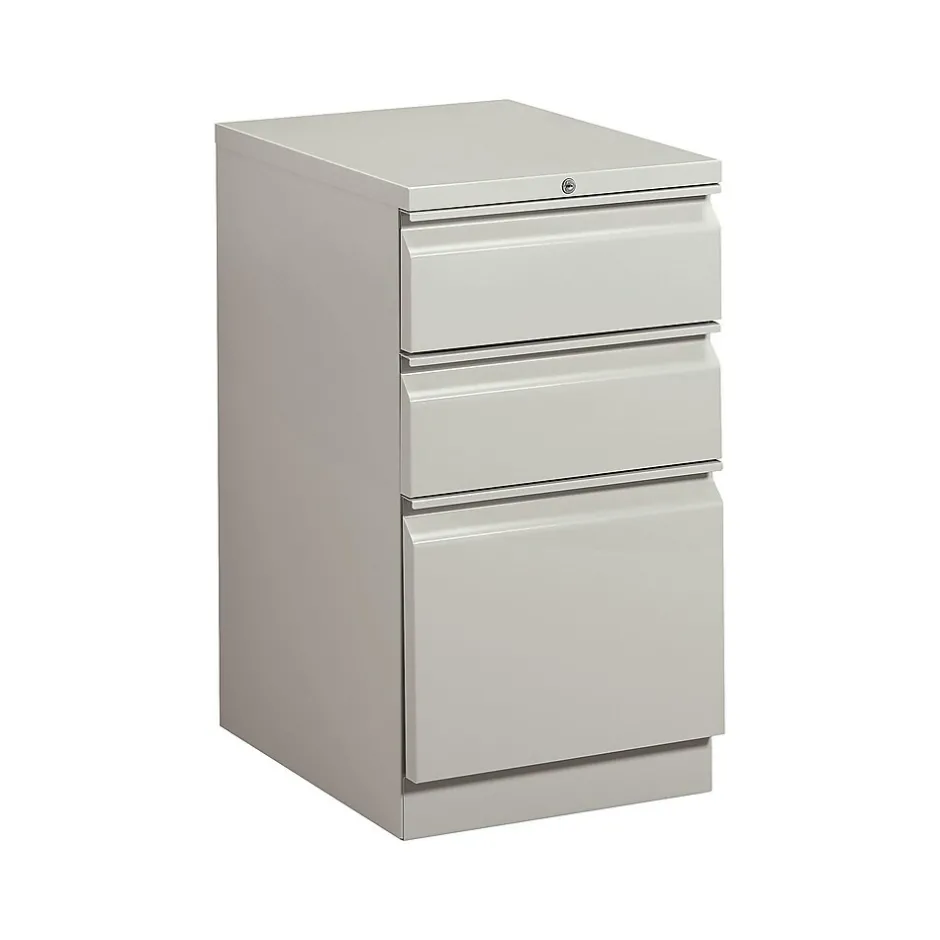 Organize a work space with this file cabinet. Three box drawers with ball bearing suspension provide easy-access storage for office supplies, and the file drawer at the bottom allows for organization of documents and hanging file folders. Measuring 28 inches tall, this HON Brigade vertical cabinet can fit under your desk to save space, or you can set it nearby for additional counter space.