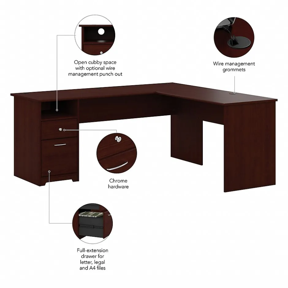 The Bush Furniture Cabot 72W L Shaped Computer Desk with Drawers presents a home office solution with transitional style. Take advantage of the 72-inch L Shaped Desk surface to spread out with a computer and all the materials needed to power through your next project or assignment. The durable desktop supports up to 200 pounds and includes built-in wire management to keep cords and cables out of the way while you work. A single file drawer opens on smooth full-extension ball bearing slides for an effortless reach to letter, legal, and A4-size paperwork. The box drawer organizes writing utensils, notepads, and other small office supplies while the open cubby shelf is perfect for work-in-progress and frequently used materials. This corner desk with storage has been rigorously tested to meet or exceed ANSI/SOHO quality standards for safety and performance and is backed by a 1 Year Warranty.