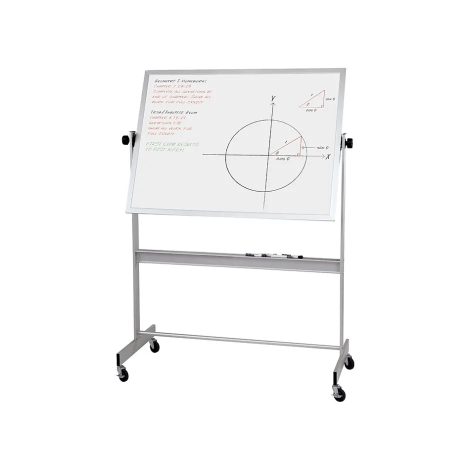 Express your ideas visually to colleagues or students with this double-sided porcelain steel dry-erase board with an attractive aluminum frame. The 360-degree pivot hinge lets you smoothly flip the board to access the other side, and the board locks in place to prevent accidental tilting or flipping during use. Keep markers handy in the full-length tray built into the base. This Best-Rite whiteboard has 3-inch locking casters for mobility.