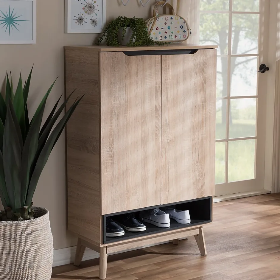 The solution to stylish and functional shoe storage lies within the Baxton Studio Fella 46″ High Shoe Cabinet. The Fella is constructed from durable MDF wood in an oak and gray finish. Two doors conceal five shelves with space to store sneakers, heels, and more. An open shelf below the doors provides additional storage space. Inset handles grant easy access. Inspired by mid-century modern design, the cabinet showcases splayed legs. The Fella shoe cabinet is made in Malaysia and requires assembly.
