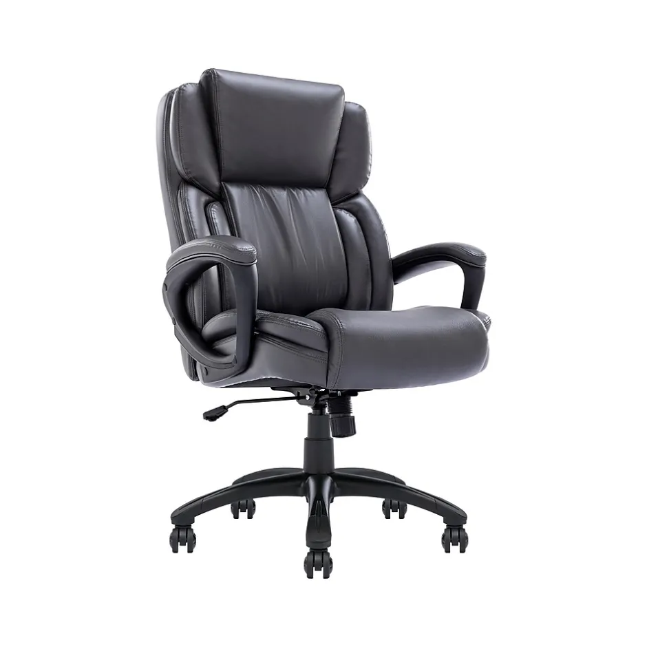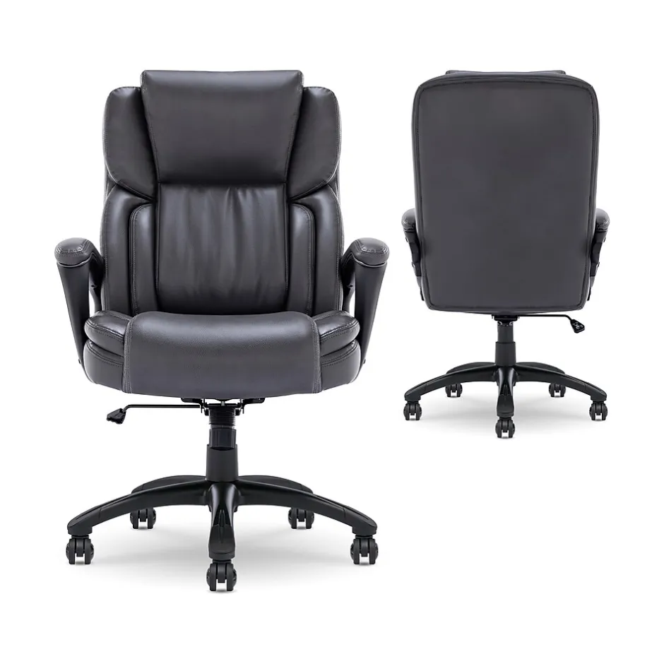 Bring relaxation to your busy workday with the Serta Garret executive office chair. Serta kept comfort in mind while designing this desk chair, with luxurious layered body pillows, a contoured lumbar zone, and padded armrests for all-day ease and exceptional support during long periods of sitting. The waterfall seat edge reduces pressure on the back of the legs and increases circulation, which helps decrease fatigue while seated. The ergonomic office chair features both recline and seat height adjustment settings, allowing you to find your optimal seating position. This desk chair is upholstered in supple bonded leather with contrast stitching for comfort and style in any workspace.