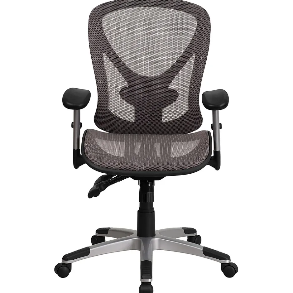 Mesh office chairs can keep you more productive throughout your work day with its comfort and ventilated design. This chair features transparent, breathable mesh material that allows air to circulate. The mid-back design offers support to the mid-to-upper back region. The tilt lock mechanism offers a comfortable rocking/reclining motion. The free rein motion is great for taking a quick break from typing to answer phone calls and relax. The waterfall front seat edge removes pressure from the lower legs and improves circulation. Chair easily swivels 360 degrees to get the maximum use of your workspace without strain. The pneumatic adjustment lever will allow you to easily adjust the seat to your desired height. The silver nylon base with black caps prevents feet from slipping when resting on chairs base.