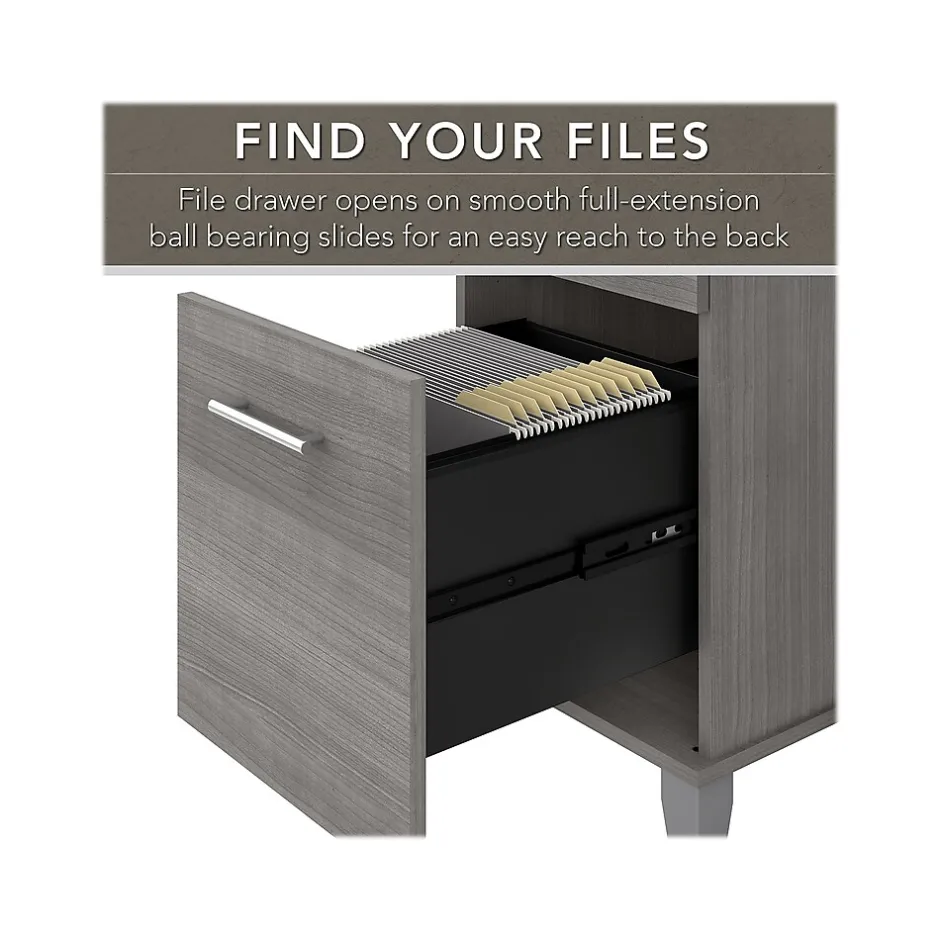 The Bush Furniture Somerset 72″W three-position adjustable desk with hutch and file cabinet offers an ergonomic solution for the home or small office. The adjustable desk with hutch and lateral file cabinet offers an ideal solution for those seeking a stylish and functional workspace. The mechanical lift-and-lock system allows the 42″W x 24″D return to lock into place at standing heights of 35″, 38″, and 41″ and easily returns to a seated position. The office desk includes its own storage with a file drawer and a box drawer for documents and supplies you want to keep close by. The hutch adds two frosted glass doors for concealed storage as well as open cubby spaces with three shelves. The two-drawer filing cabinet accepts legal- and letter-size paperwork. Fixed surfaces are tested to meet ANSI/SOHO standards for safety and performance while the mechanical lift system is rigorously tested to Bush Furniture’s own quality standards. Backed by a 6-year warranty.