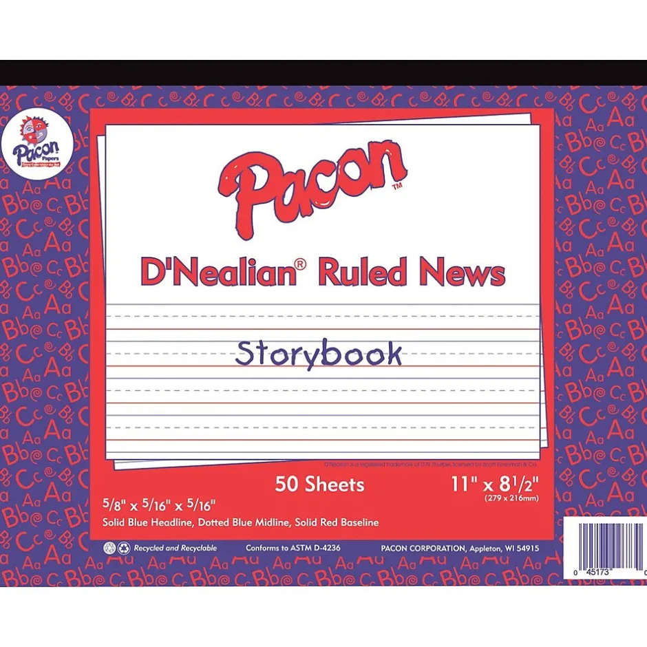 Clean white newsprint printed both sides with blue headline, broken blue midline, red baseline and skip-A-line format. Rulings conform to D’Nealian™ handwriting program.