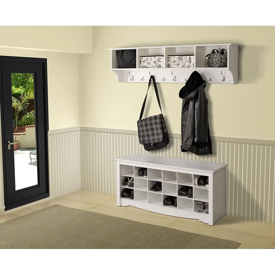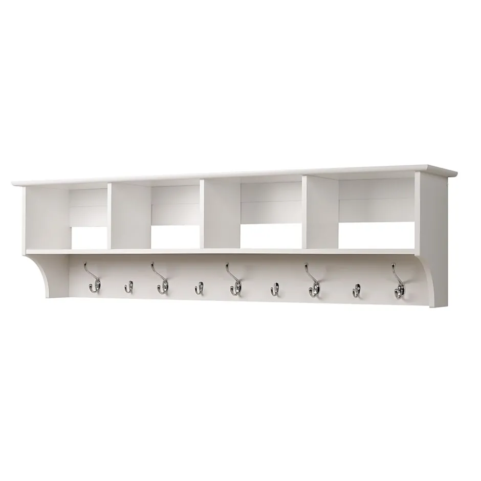 - Includes Prepac 60″ entryway cubby shelf, hanging rail system, owner’s manual