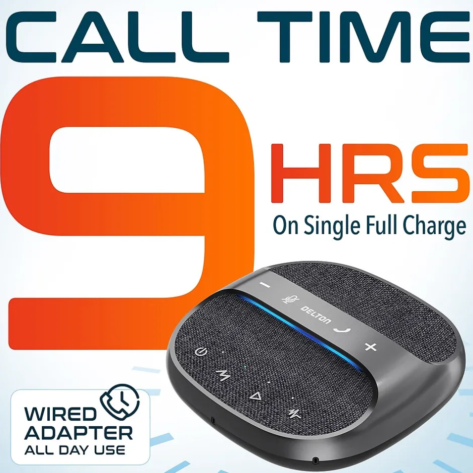 - Offers up to nine hours of call time on a single full charge, sufficient for extended meetings