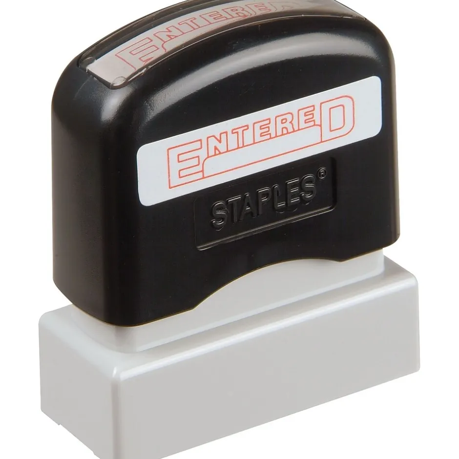 Mark documents as completed with this pre-inked stamp. The large Entered message lets you know when invoices, pay sheets, and other documents have been put into the system, and the empty box lets you add a date and time. This Offistamp pre-inked stamp creates bold red impressions for better visibility.