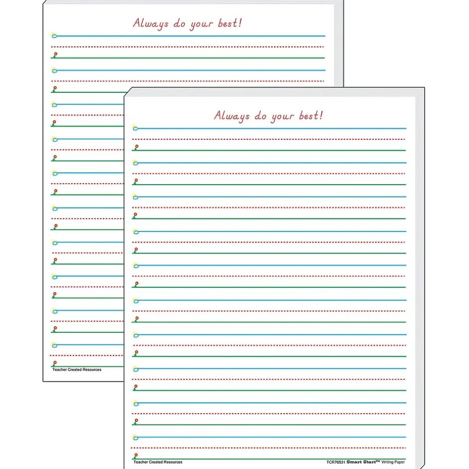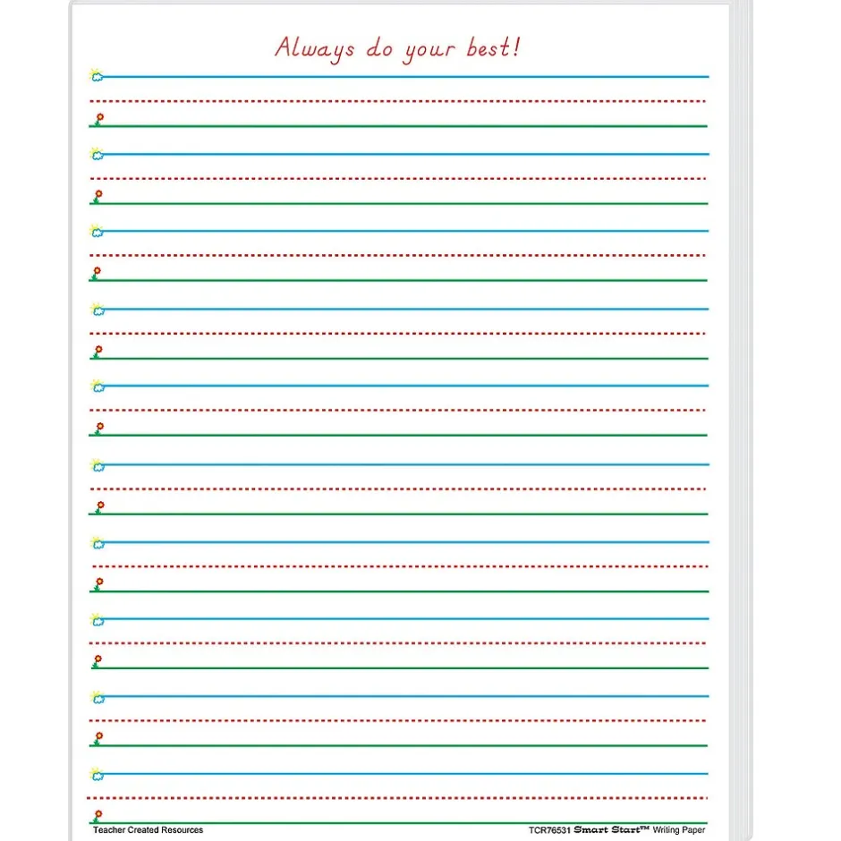 Smart Start Writing Paper (8-1/2″ x 11″) is truly a “Smart Start” for beginning and experienced writers. Bold graphics in blue, green, and red promote the feeling of success as children simply “Start at the Sky and pull down to the Ground” to form letters correctly. 1-2 Writing Paper lines have 5/8″ spacing. Each pack includes 100 sheets. Sold as 2 packs for a total of 200 sheets.