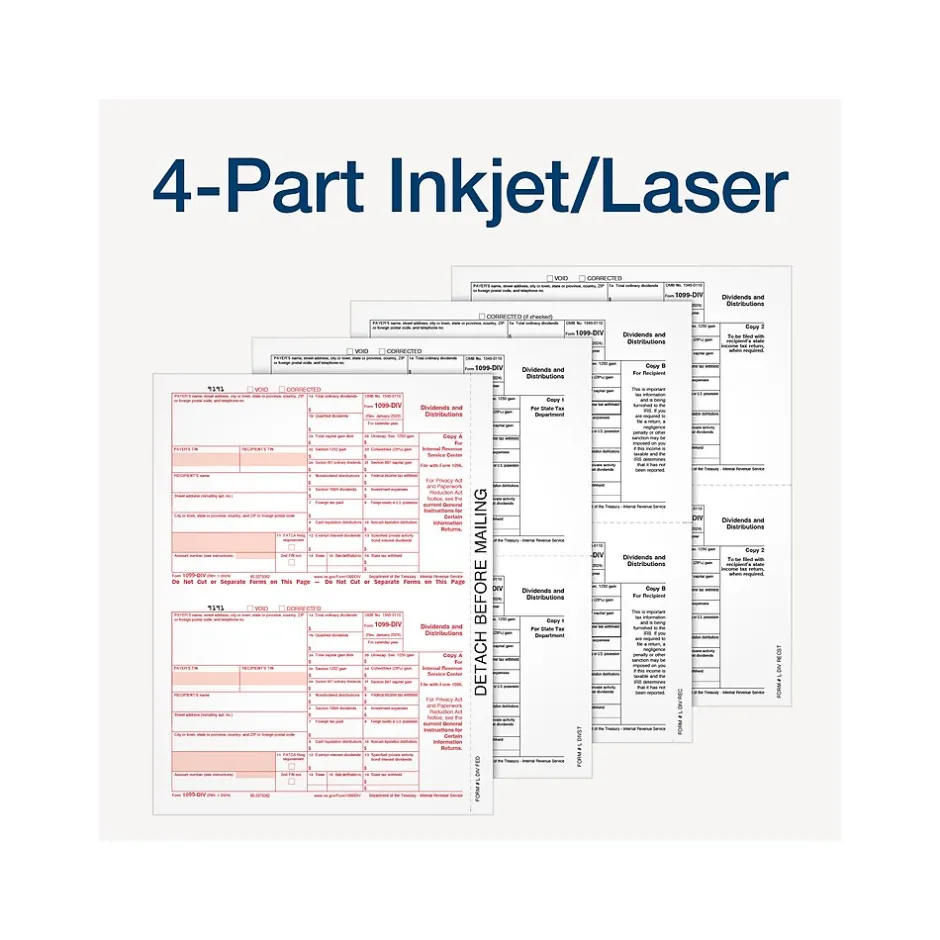 - 4-Part 1099-DIV forms print 2 to a page on 5 micro-perforated sheets with copies A, 1, B & 2