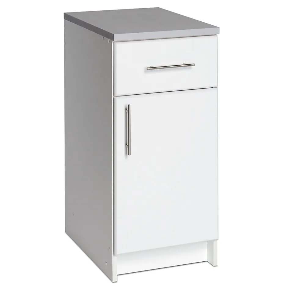 Prepac™ Elite 16″ base cabinet is constructed from CARB-compliant laminated composite woods. Cabinet has durable fresh white laminate finish with 1″ thick worktop with a durable melamine surface.