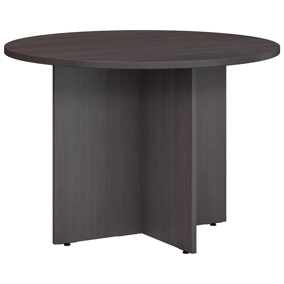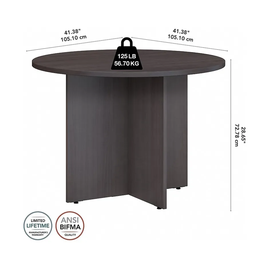 Bring your team together in an open or private work environment with the Bush Business Furniture 42W Round Conference Table. At just the perfect size, the multipurpose table comfortably seats 4 in a collaborative classroom or training area, private office, or small conference room without taking up too much space. A finished underside prevents snagged clothing, while a classic wood base provides durability and stability on any floor. Continuous edge banding protects against nicks and dings from collisions, and the thermally fused laminate finish resists stains and scratches throughout years of everyday meetings. The commercial-grade Round Conference Table meets ANSI/BIFMA quality test standards and comes with a Bush Business Furniture Limited Lifetime Warranty. Browse the complete line of Conference Tables, available in a variety of styles and finishes to complement your office. American made with U.S. and imported parts.