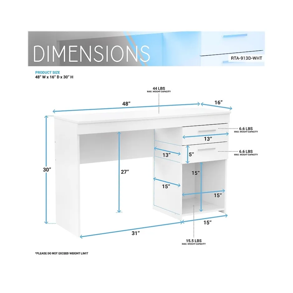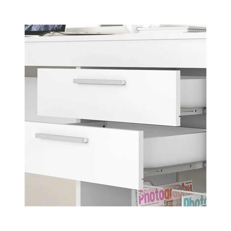 This contemporary workstation desk brings a touch of sophistication to your workspace. Its design is perfect for home offices, offering a generously extended work surface with ample storage. Crafted from durable particleboard with a painted surface, this classic desk with modern appeal makes a statement to any decor. The two pullout drawers keep office essentials within reach while the open shelf at the bottom aids in keeping clutter under control.