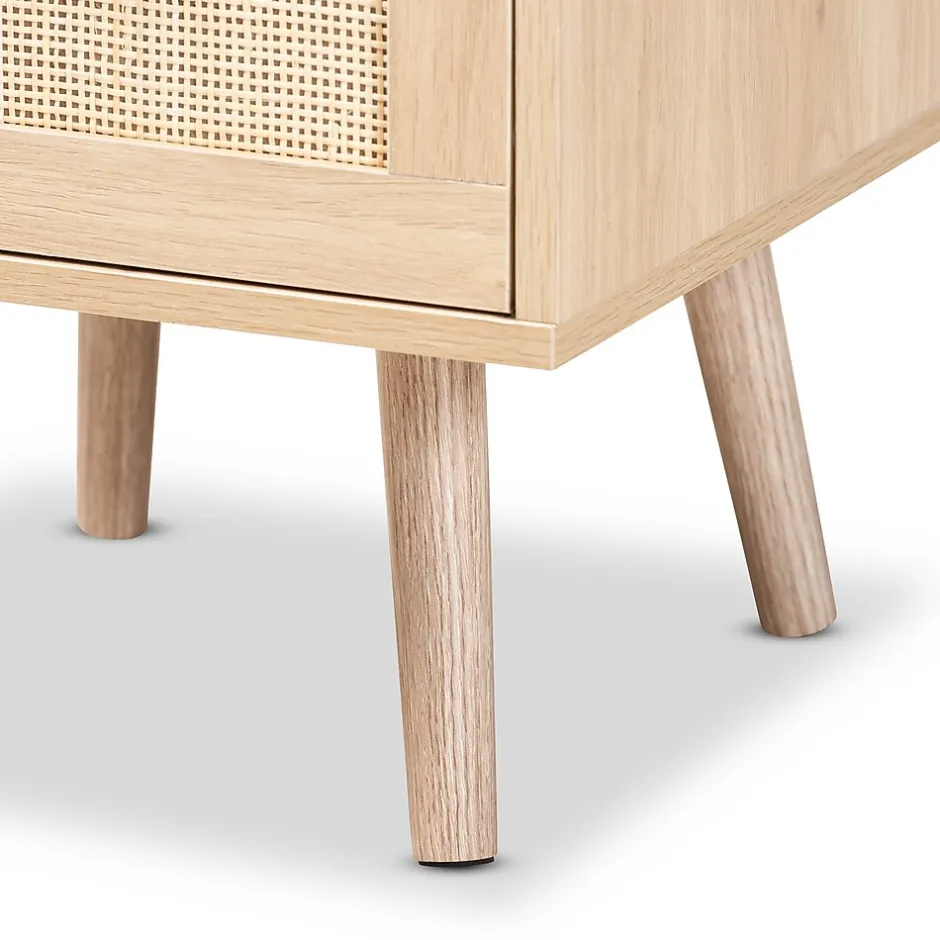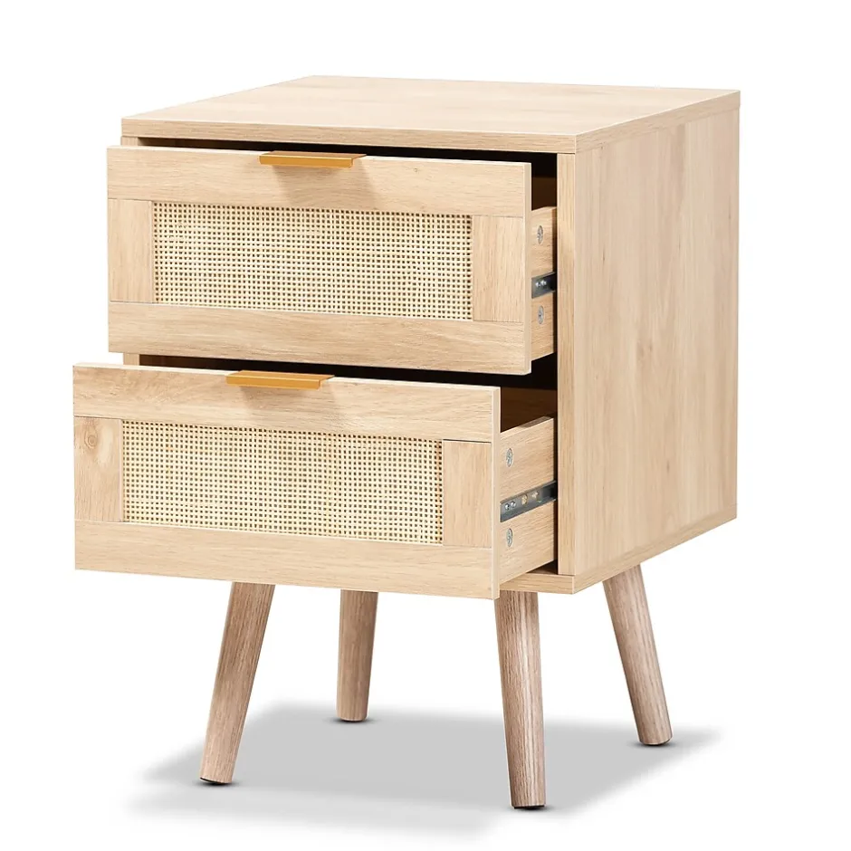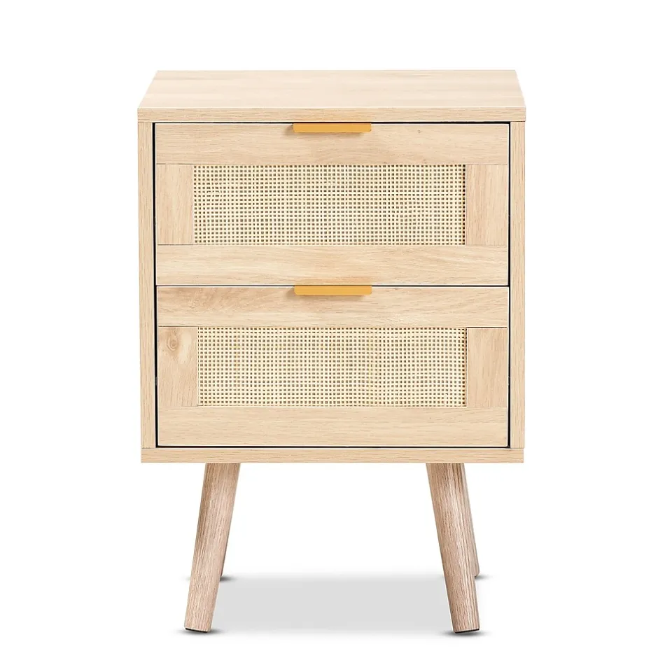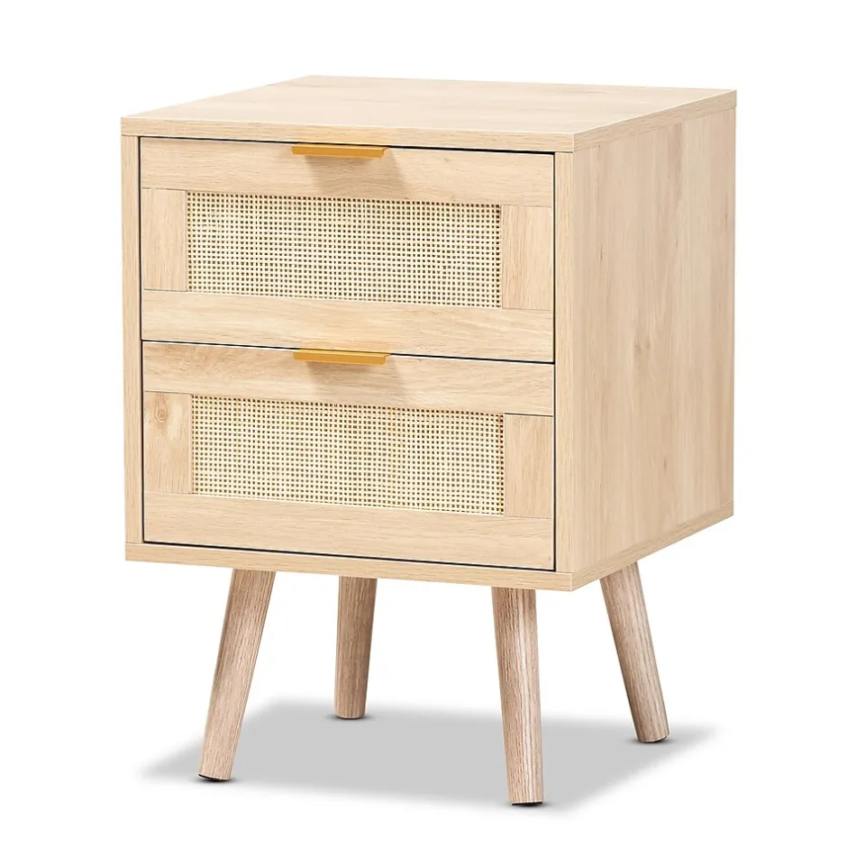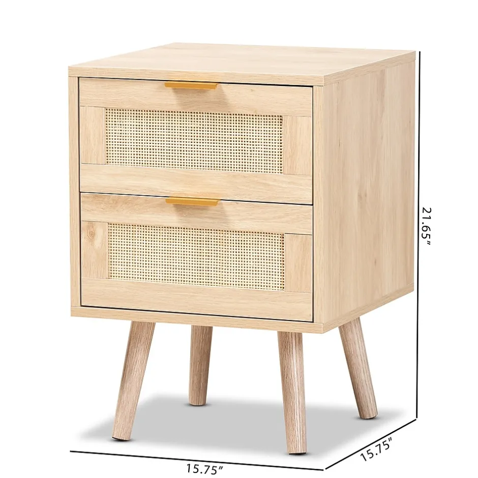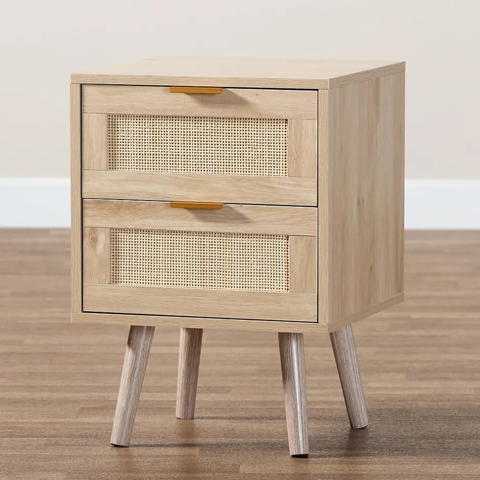 Add a retro inspired accent to your bedroom with the stunning Baird nightstand. Made in China, the Baird is comprised of sturdy wood showcasing a light oak brown finish. Two drawers and a square tabletop offer plenty of space for all your bedside essentials. Requiring assembly, the nightstand features woven rattan drawer faces and gold tone metal handles for eye catching style. A handy piece brimming with personality, the Baird nightstand is sure to enhance any bedroom.This is a product of nature and may have variations in areas such as, but not limited to, color, pattern, grain and texture. The hair-like strands of rattan/rattan-fiber are common due to nature of the material.