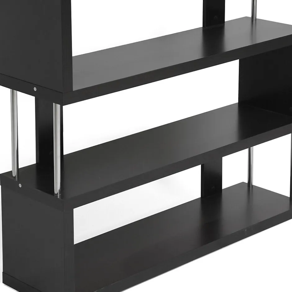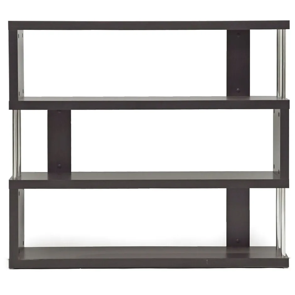 This artsy, modern bookcase gets you organized with style.Our Barnes bookcase is made of dark brown faux wood grain paper veneer over and engineered wood frame and features chromed steel side supports.