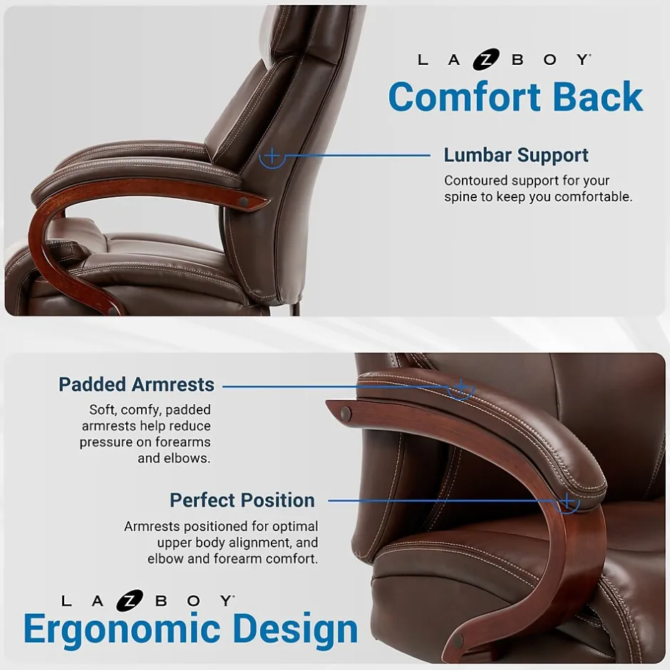Give your workspace an air of sophistication with this La-Z-Boy Bradley executive chair. The soft bonded leather upholstery offers a rich, inviting texture, while the warm color scheme delivers classic style. The elevated headrest, built-in lumbar support and curved waterfall seat provide all-day comfort. This desk chair features simple controls, so you can adjust the seat height and tilt tension to meet your personal preferences. A sturdy five-star base and rolling casters make it easy to move this chair from your desk to a nearby filing cabinet, credenza or printer stand. Complete with rich wood-finish accents, this La-Z-Boy Bradley executive chair brings CEO-worthy good looks to your corner office.