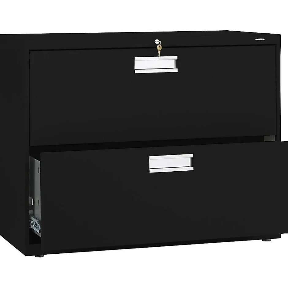- Two-drawer lateral filing cabinet holds letter- or legal-size documents