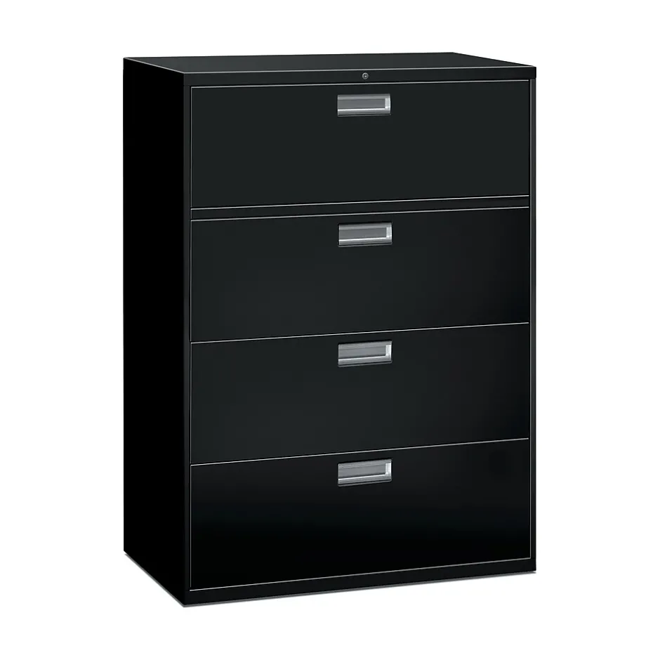 - Four-drawer lateral filing cabinet holds letter- or legal-size documents