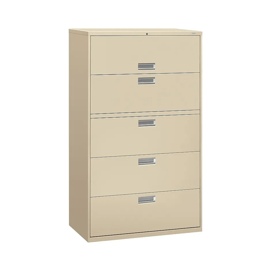 Organize important files and documents with this five-drawer lateral file cabinet. The integrated two-sided locking mechanism prevents unauthorized entry, and the built-in counterweight prevents the cabinet from tipping forward when the drawers are fully extended. This HON Brigade 600 lateral file has heavy-duty steel ball bearings that makes the drawers easy to open and close, and the all-welded case helps the cabinet stand up to commercial environments.