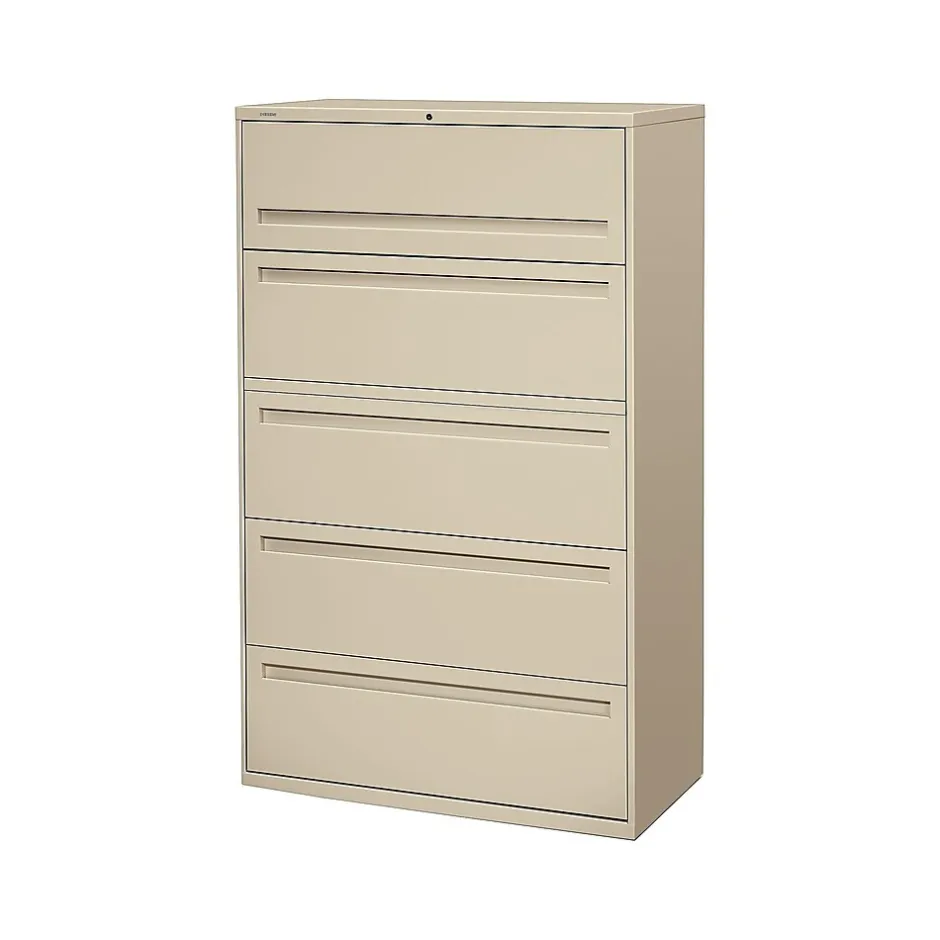 - Five-drawer lateral filing cabinet holds letter- or legal-size documents