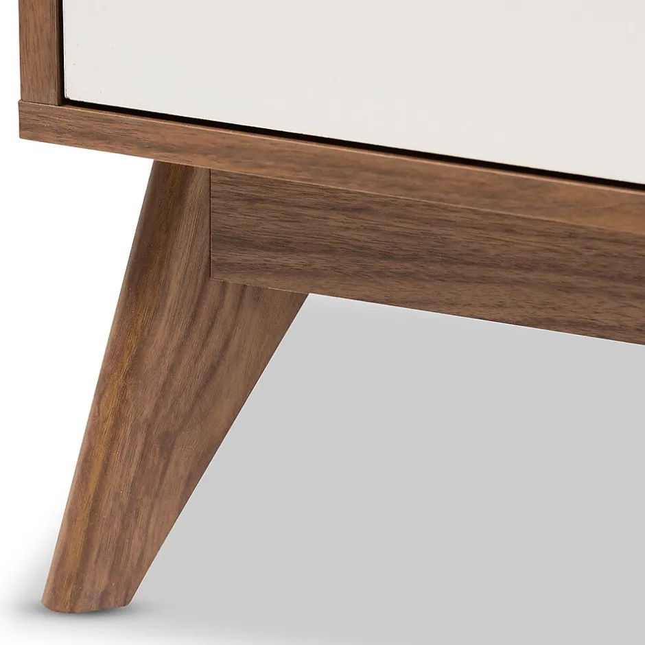 Featuring clean lines and extensive storage space, the Baxton Studio Brighton 37″ High 6-Drawer Chest is a sleek and functional addition to the bedroom. The Brighton is constructed from MDF wood in a walnut and white veneer finish. Six drawers provide space for storing linens, clothes, and more. Cut-out handles and runners provide easy access to the drawers. Inspired by mid-century modern design, the chest showcases splayed legs. The Brighton chest is made in Malaysia and requires assembly.