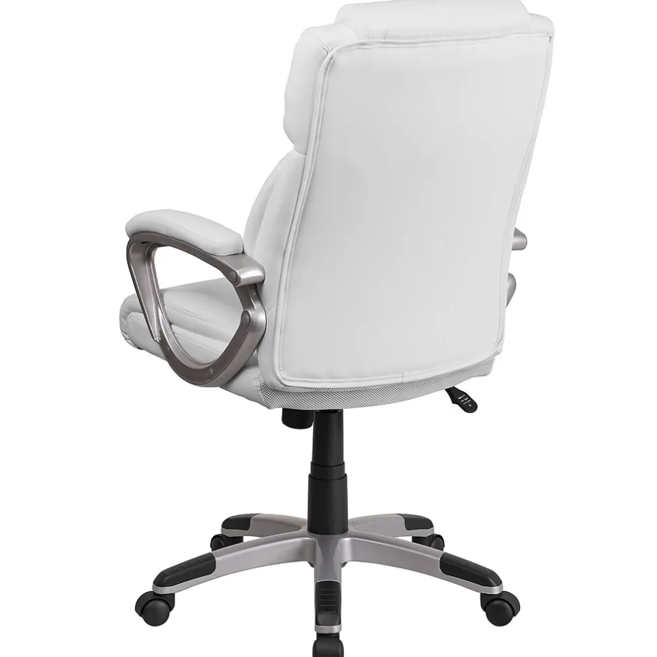 When impeccable form follows precise function the result is this black executive LeatherSoft office chair that offers a stylish appearance as well as custom comfort. The mid-back design provides support to the mid-to-upper back region. LeatherSoft is leather and polyurethane for added Softness and Durability. Turn the tilt tension adjustment knob to increase or decrease the amount of force needed to rock or recline. Lock the seat in place with the tilt lock mechanism. The waterfall front seat edge removes pressure from the lower legs and improves circulation. Chair easily swivels 360 degrees to get the maximum use of your workspace without strain. The pneumatic adjustment lever will allow you to easily adjust the seat to your desired height. The silver nylon base with black caps prevents feet from slipping when resting on chairs base. This chair will be an outstanding work from home or office chair.