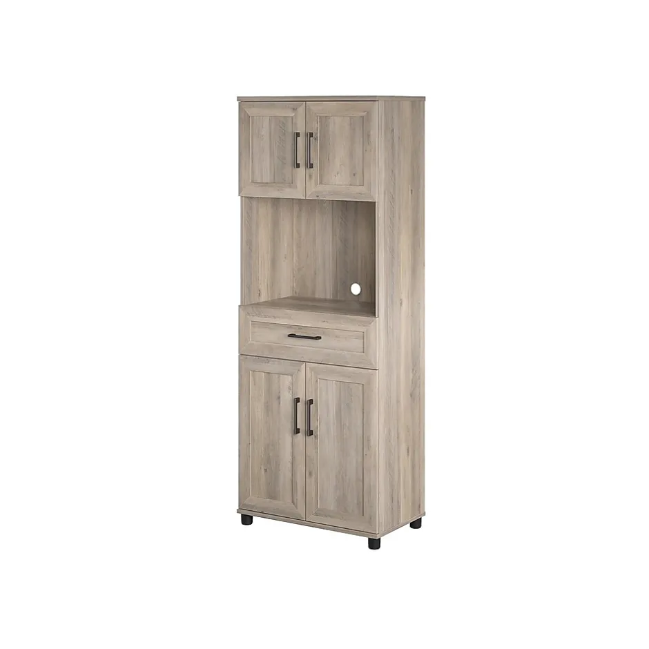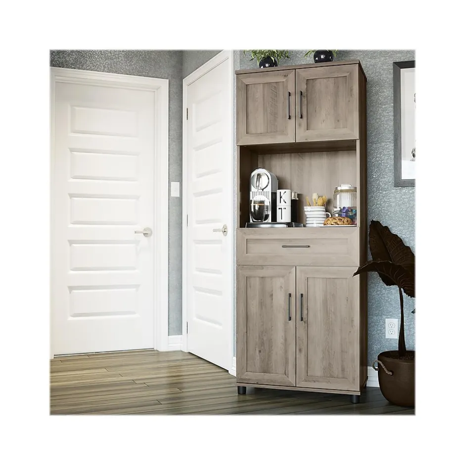 Skip the expensive coffee shops, and bring it all home with your System Build Dwyer tall coffee bar with one drawer and four doors. The bar features a rustic gray oak finish and clean modern farmhouse hardware. Simple yet essential in your home office or kitchen, with space to store everything you need to make the perfect cup of joe. Carefully crafted with modern European-style hinges, adjustable shelving, and durable side-mounted drawer slides for lasting enjoyment. Pair your coffee bar with the matching System Build Dwyer pantry (not included) to create the perfect kitchen combo.