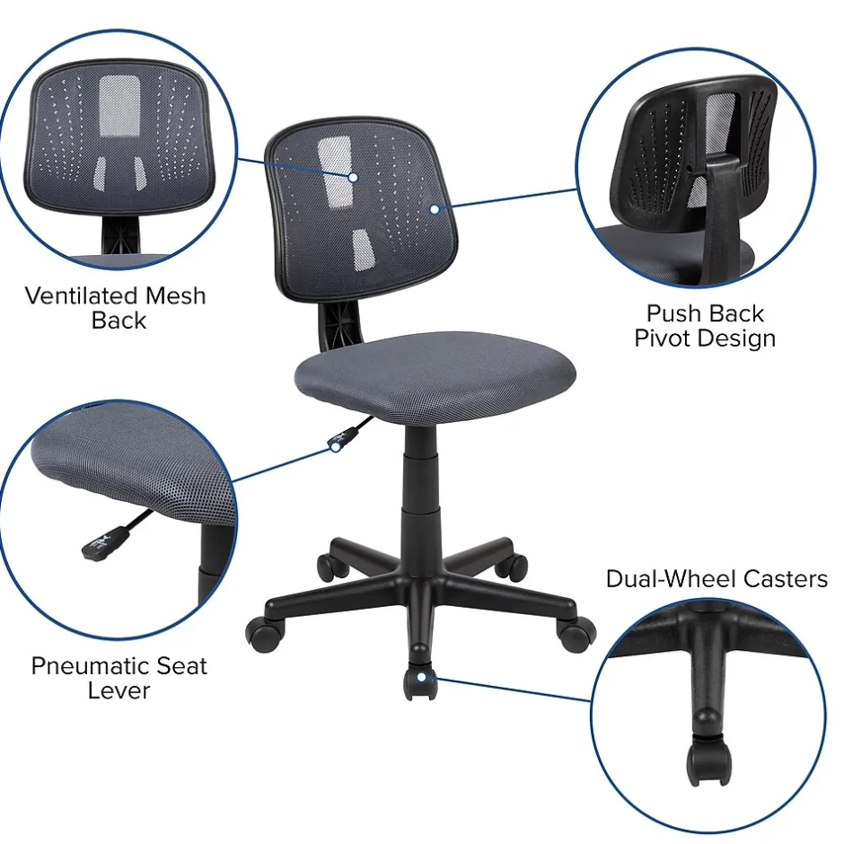 Tackle the workday with any challenge that comes your way on this snazzy desk chair. The cooling designer back features mesh material for exceptional airflow combined with gentle curved lumbar support. Our Fundamental Task Chair will make an impressive footprint in your office with its cutting edge structure. The innovate back pivots backward while leaning back for a comfortable resting period. Adjust your office desk chair with the pneumatic adjustment lever that controls the height of your seat. Effectively switch between tasks with 360 degrees of swivel motion. Providing exceptional value for today’s modern office, our Fundamental Seating will afford you the opportunity to purchase seating for students and small businesses.