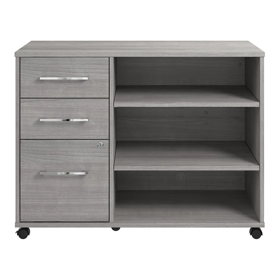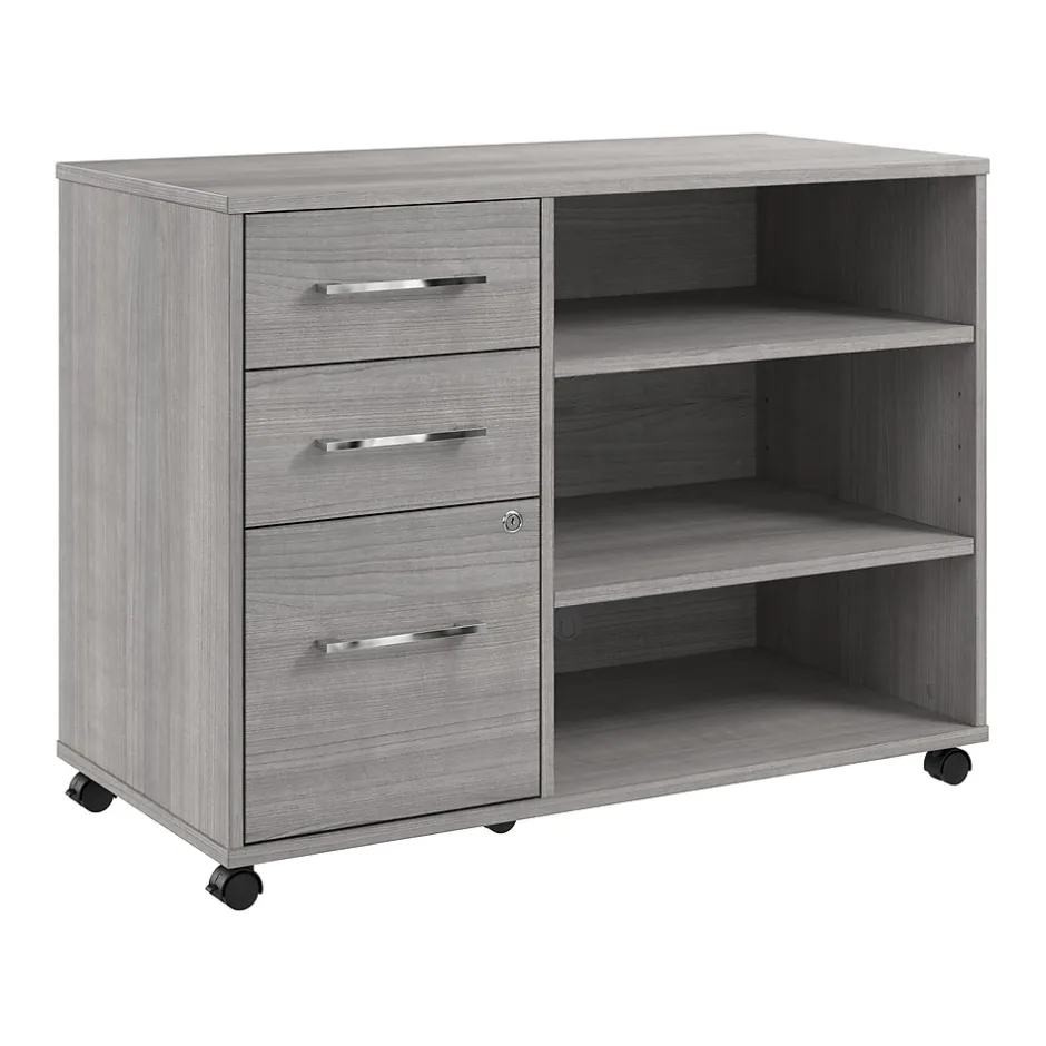 The Bush Business Furniture Hustle Office Storage Cabinet with Wheels provides the form and function needed to support your entrepreneurial spirit without breaking the bank. An ideal choice for small to medium-size businesses and home offices alike, the small cabinet rolls throughout your workspace to provide storage where it’s needed most. The left side features three drawers: one file drawer for letter, legal, and A4-size papers and two box drawers for small office supplies. Drawers can be locked to safeguard sensitive documents as well as valuable items. The office cabinet’s open storage area includes two adjustable shelves for work materials and equipment. This file cabinet with shelves has been meticulously designed and tested to meet or exceed ANSI/BIFMA standards for safety, durability, and performance and is backed by a 10 Year Warranty. American made with U.S. and imported parts.