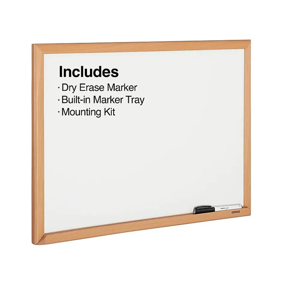 Sketch designs and visualize concepts with this dry-erase whiteboard. The smooth white surface makes words and pictures stand out, and the melamine material is easy to wipe clean. A built-in marker tray lets you keep multiple writing instruments close at hand. This Staples melamine dry-erase whiteboard is easy to mount on most walls and includes a marker so you can start brainstorming right away.