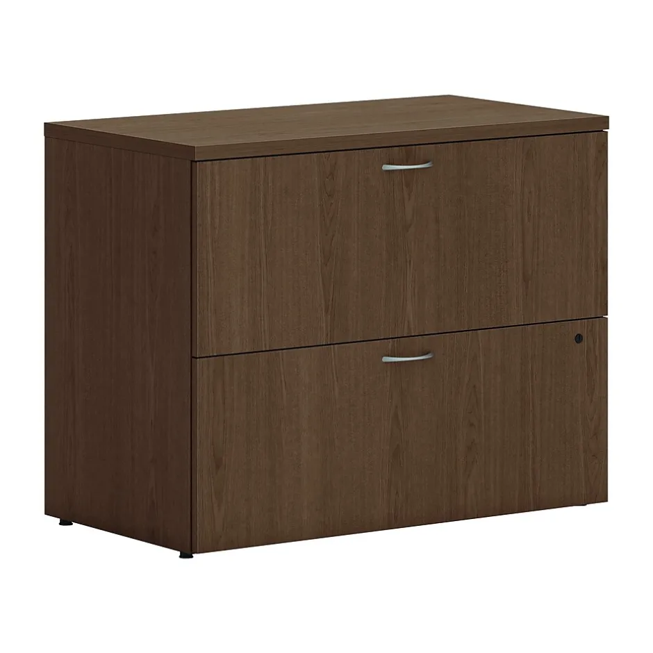 - Two-drawer lateral file cabinet holds letter- or legal-size documents