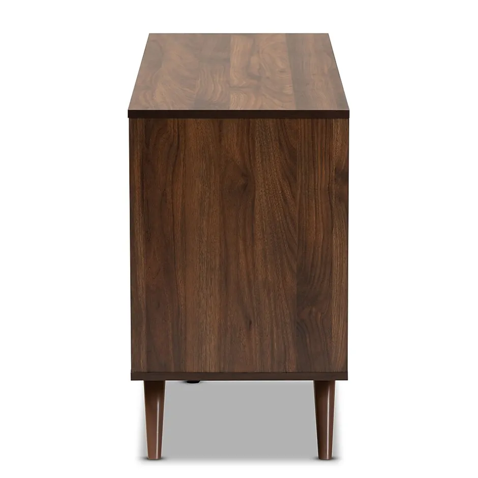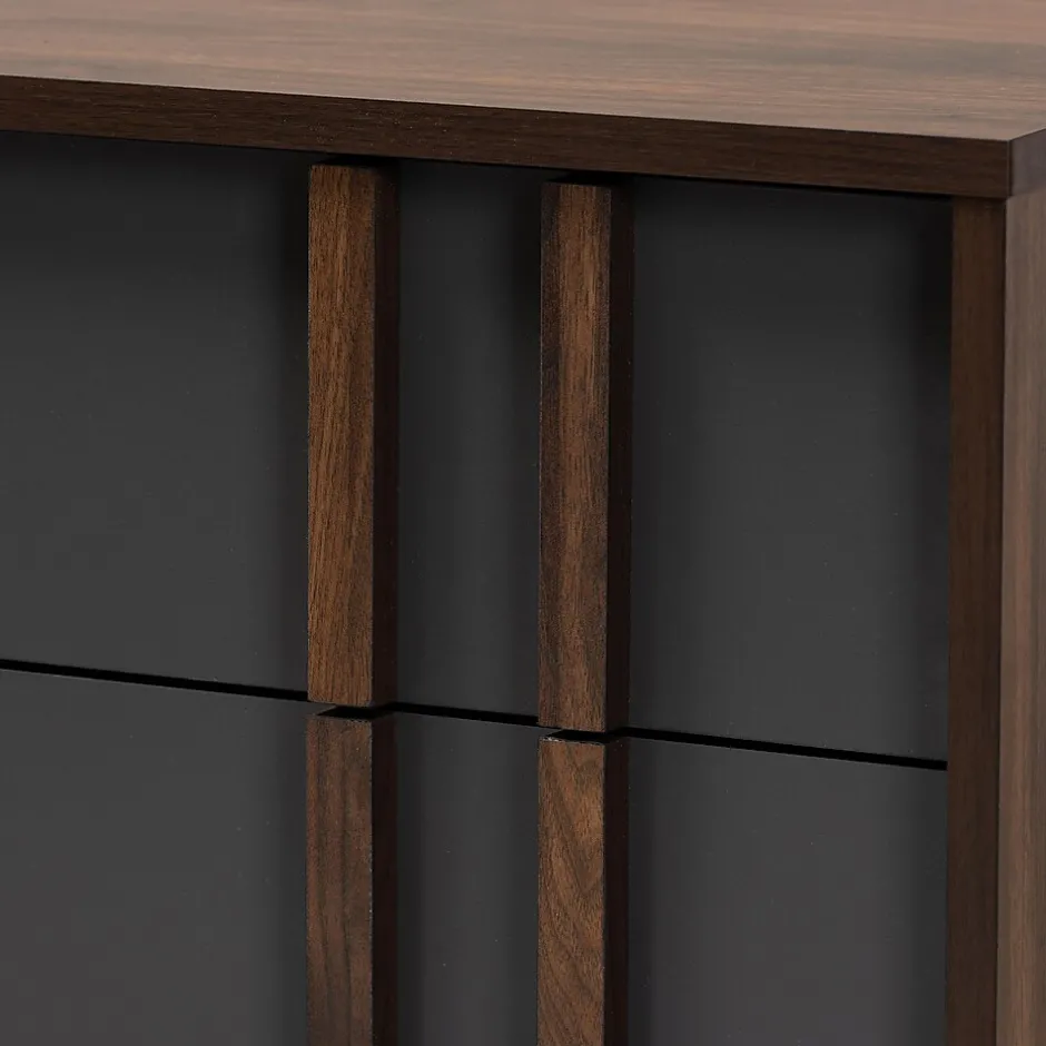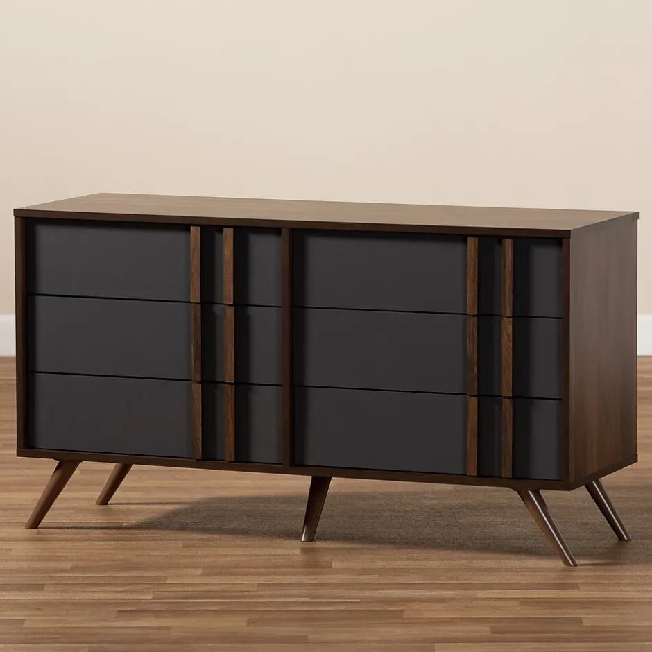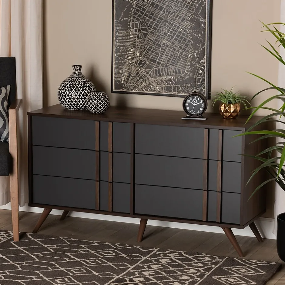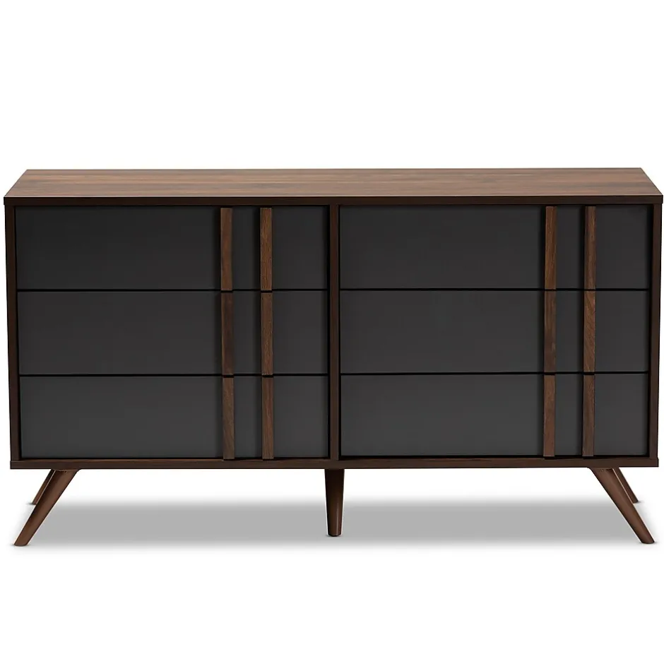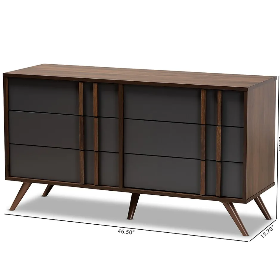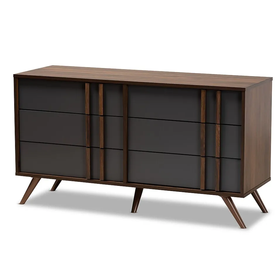 With an ultra-modern, two-tone finish and ample storage space, the Naoki dresser is sure to make an impression in any space. Made in Malaysia, this wood dresser features five spacious drawers to store clothes, linens, and more. Each drawer is fitted with metal glides for smooth movement. A two-tone grey and walnut finish are paired with long, double vertical handles for a cool, contemporary look. Requiring assembly, the Naoki dresser is supported by splayed legs that create a chic, retro profile.
