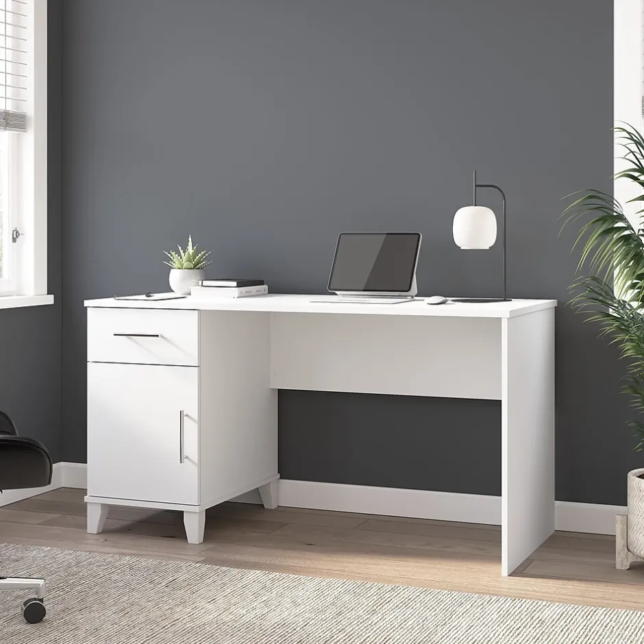 A spacious work surface and built-in storage make the Bush Furniture Somerset 54W Office Desk with Drawers a perfect choice for your home office. The desktop offers plenty of room to spread out and includes a convenient wire management grommet. The Desk’s file drawer opens on smooth full-extension ball bearing slides for easy access to legal and letter size documents while a box drawer keeps the office supplies you need close by. Drawers can be mounted to either side for a custom configuration. Somerset’s transitional styling and several attractive finish options with tapered leg accents and contemporary metal hardware offer an appealing look that works with virtually any decor. The 54W Office Desk with Drawers is tested to meet ANSI/SOHO quality standards for safety and performance and is backed by the Bush Furniture 6 Year Warranty. North American made with globally sourced materials.