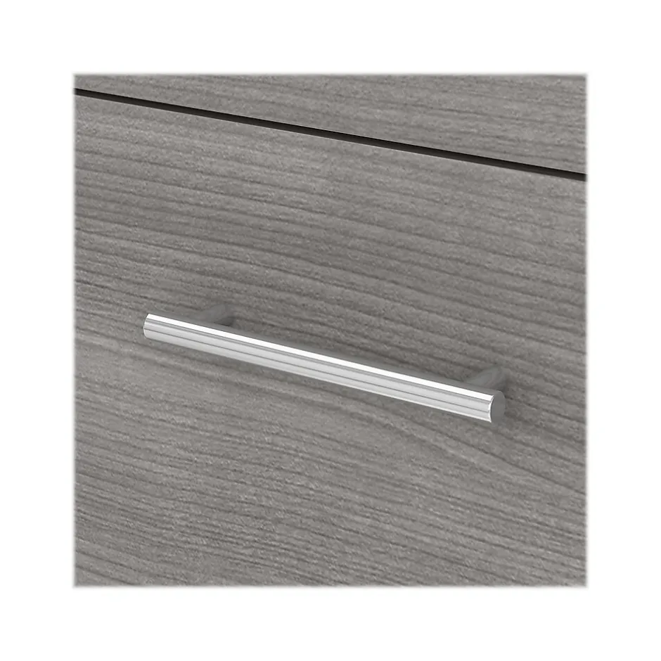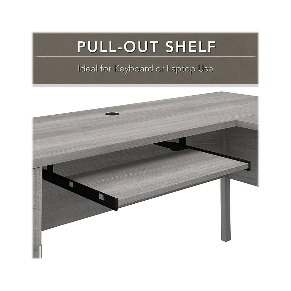The transitional Bush Furniture Somerset 72″W L-shaped desk with hutch offers a stylish and practical workspace solution for the home or small office. Maximize the potential of your home office with this L-shaped desk with hutch. Create your remote work headquarters with space for a computer, phone, printer, and more. A convenient pull-out tray provides a perfect place to keep a keyboard or laptop, while a storage cabinet and box drawer offer plenty of space for supplies. A file drawer with smooth ball bearing slides allows for easy access to letter-size documents. Wire management grommets help keep cords and cables in order. The hutch features open storage with large compartments for books or decorations, two shelves to hold work in progress, and two frosted glass doors that provide concealed storage. This home office furniture set is tested to meet ANSI/SOHO standards for safety and performance and is backed by the Bush Furniture 6-year manufacturer warranty. American-made with US and imported parts.