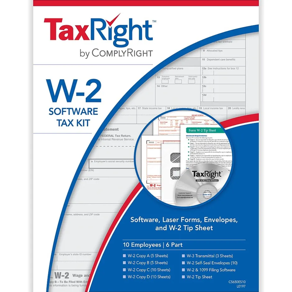 Tax Form Set includes: 6-Part W-2 laser forms, self-seal double window envelopes, transmittal forms (3) and tip sheet with guidelines on minimum requirements, penalties and common errors. TaxRight software CD with templates to assist in accurately filling out and printing W-2 forms.