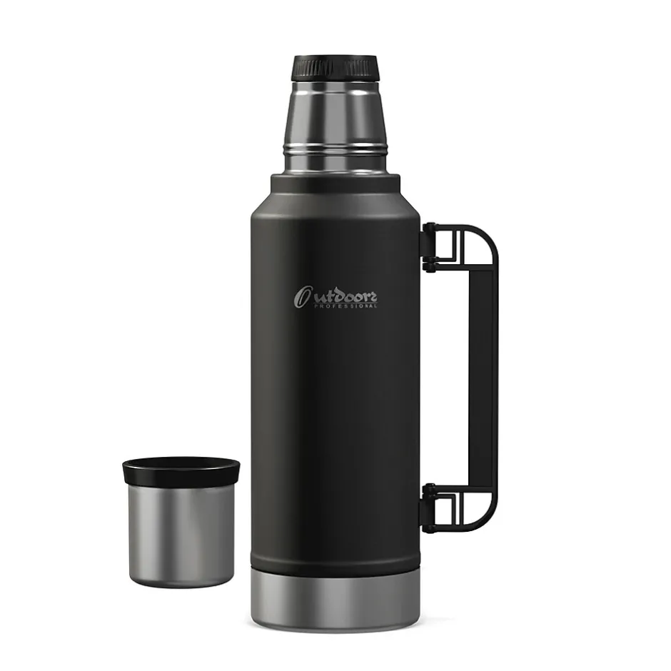 The Outdoors Professional Black 33.8-Oz. Termo Classic Vacuum Bottle with Carry Handle is made with superior insulation that keeps liquids (soup, coffee, tea) hot for up to 24 hours or cold drinks cool for up to 24 hours. Add ice to your favorite beverage and the Termo classic will keep it cold for up to 5 days. The rustproof stainless steel construction means it can work just as hard as you do without impacting its performance. This is an ideal bottle to throw in your truck, work bag, or travel with it. It’s made with BPA-free materials, keeping its contents safe to consume. This 1-L bottle features a leak-resistant lid, so you can put it in your backpack without worrying about any spills. The wide mouth opening helps with easy pouring into the lid that doubles as a cup. The collapsible handle makes it easy to transport when you’re on the go.