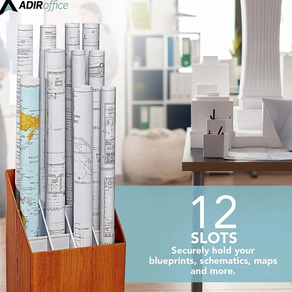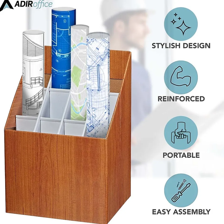 The AdirOffice upright roll file provides lightweight and economical upright storage for blueprints, plans, and maps. The compact upright roll file box can squeeze in anywhere. Features 12 compartments measuring 3″ across. The compartments are reinforced along the sides and tops with plastic molding to prevent rips and snags. Made of durable corrugated fiberboard in a walnut wood-grain finish. Set of two.