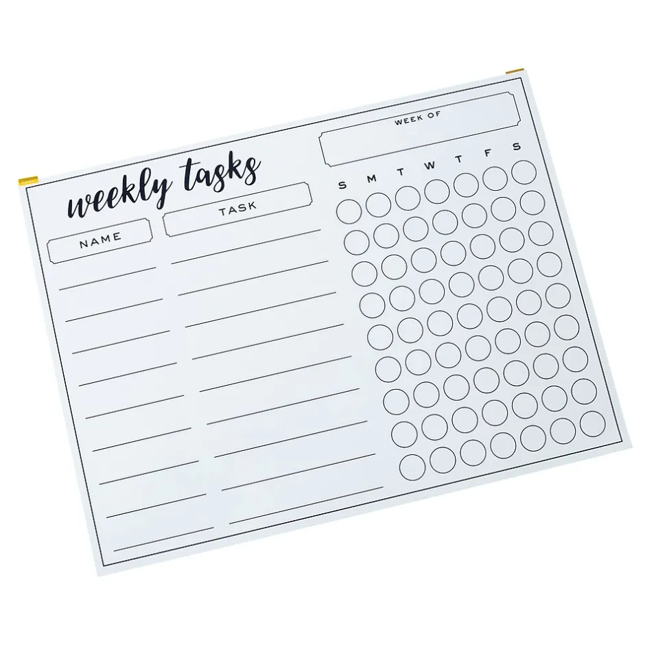 The Martha Stewart dry-erase weekly task board to keep track of your tasks in style. Affixes to most surfaces and can be removed without damaging the wall. Can be used with most dry-erase markers and wipes clean with a dry cloth.