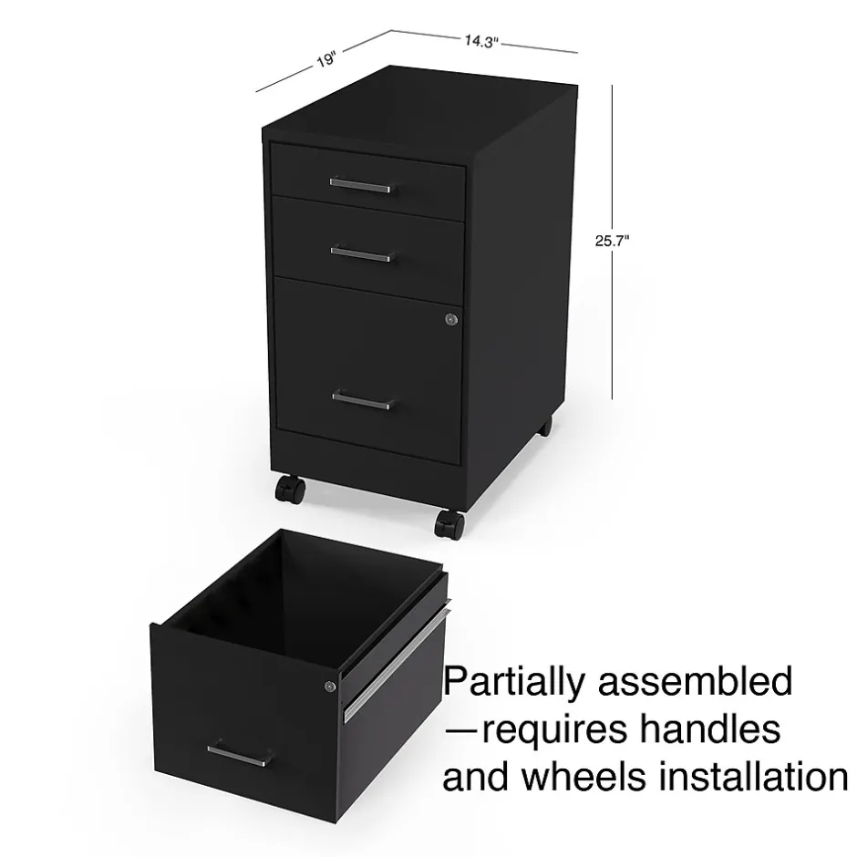 - Three-drawer filing cabinet holds letter size documents