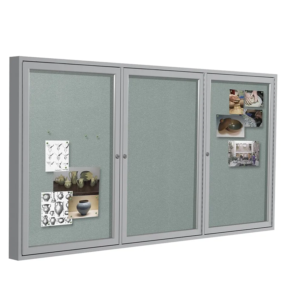 Ghent’s Enclosed Vinyl Bulletin Board is the perfect way to display messages, pictures, and important information securely. The message center is made with a vinyl tack surface that hides pin holes and holds up under repeated tacking, providing years of reliable service. When used outside, our vinyl board will not break down or mold, unlike cork enclosed boards. You do not have to worry about damage from weather or humidity as long as you hang the board under an awning or overhang. Ghent’s 3-door enclosed bulletin boards are protected using shatter-proof acrylic panels, full-length door hinges, and locks that are flush with the frame. You can install the board in high-traffic, public areas without worrying about damage or tampering. Hidden corner brackets allow the message center to sit flush against the wall without any visible hardware which adds protection from vandalism. The colored vinyl surface is paired with a Satin aluminum frame and includes 2 keys. Ships to you in Ghent’s worry-free packaging, designed specifically for shipping enclosed boards. Ghent’s Enclosed Vinyl Bulletin Board carries a 10-year warranty and is made in the USA. Perfect for indoor and outdoor use.