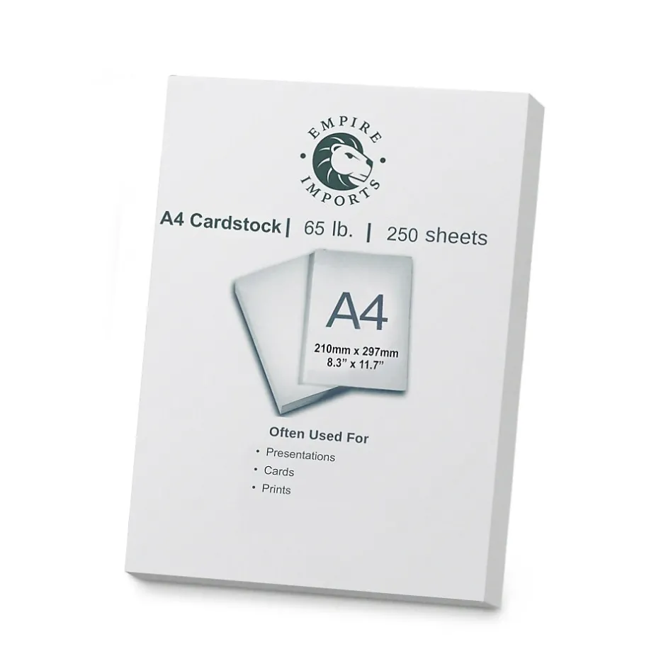 Empire Imports A4 Card Stock is a heavy-weight multi-purpose paper that is a great option for printing out business cards, presentations, memos, flyers, invitations and anything else that requires high-quality durable paper stock. The uncoated paper stock is available in a smooth white opaque finish and is made from 65 lb. paper weight. Each sheet can be cut in half to create A5 cardstock, or in quarters to create A6 sized cardstock. Each ream contains 250 sheets.