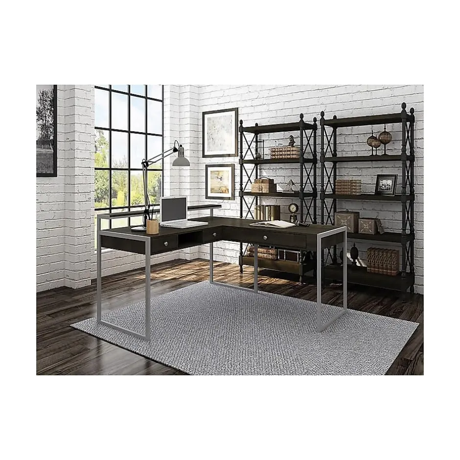 - The L-shaped desk design offers ample space for computers and office equipment