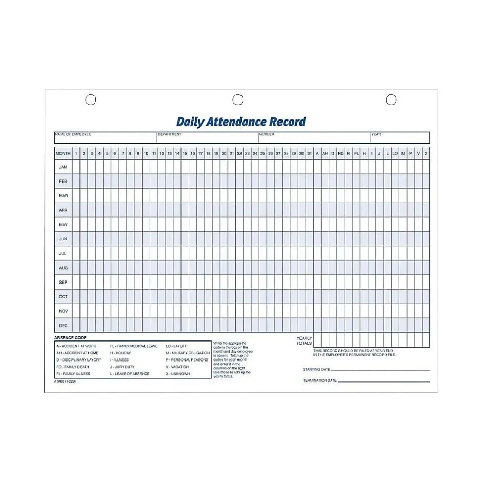 Keep track of vacation time, PTO and sick days with these attendance records. The letter-size prepunched sheets fit neatly in binders or personnel folders, while the preprinted forms make it easy to enter information about each missed day of work. A 12-month layout provides space for a whole year’s worth of attendance. With an absence code key, these Adams daily attendance records offer a simple way to designate time off.