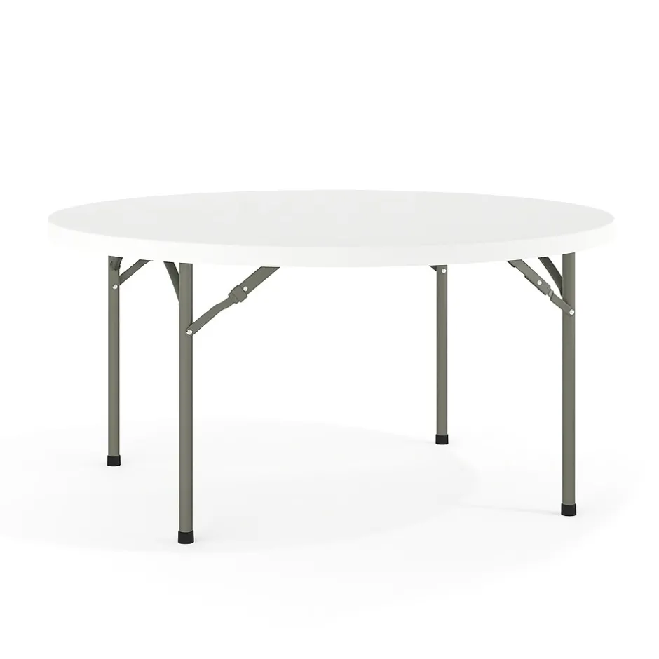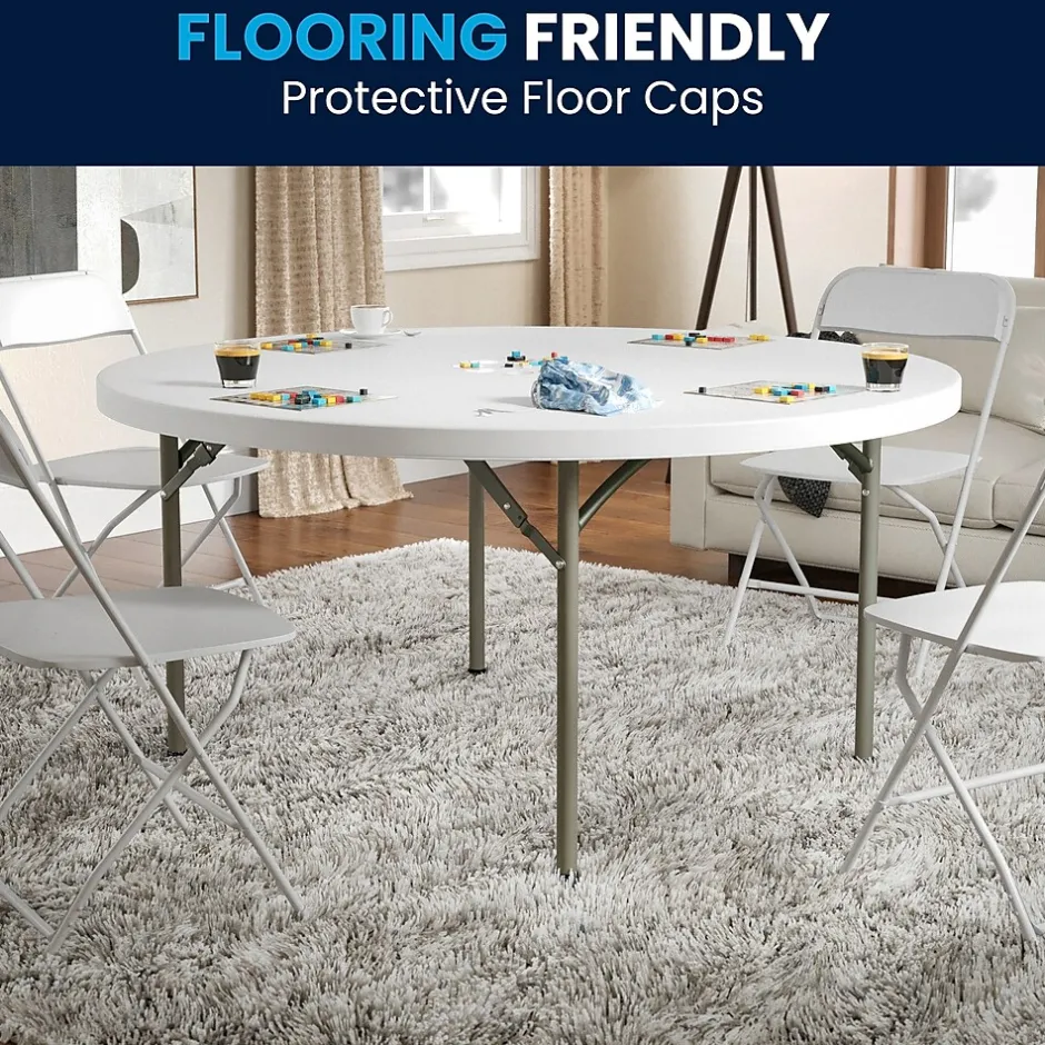 Ensure you have enough surface space for any function and take the stress out of hosting your next gathering. The round dining folding table is a great option for special event planners, catering companies and banquet facilities. This durable, easy to clean table is commercial rated for use in banquet halls, convention centers and at trade shows. Use during game night, dress it up for holiday parties, and coordinate crafts night. The thick, granite white tabletop is 60″ in diameter, 2″ thick, and will comfortably seat up to 8 adults. Its waterproof, impact and stain resistant top have a 880 pound static load capacity. Attractive gray powder coated legs lock securely in place while in use and non-marring floor caps protect your floor by sliding smoothly when you need to move the table. Designed for both indoor and outdoor use, store table indoors and protect the frame from extreme moisture. The 60″ Round Granite White Plastic Folding Table is a convenient option for your next home, school or business event.