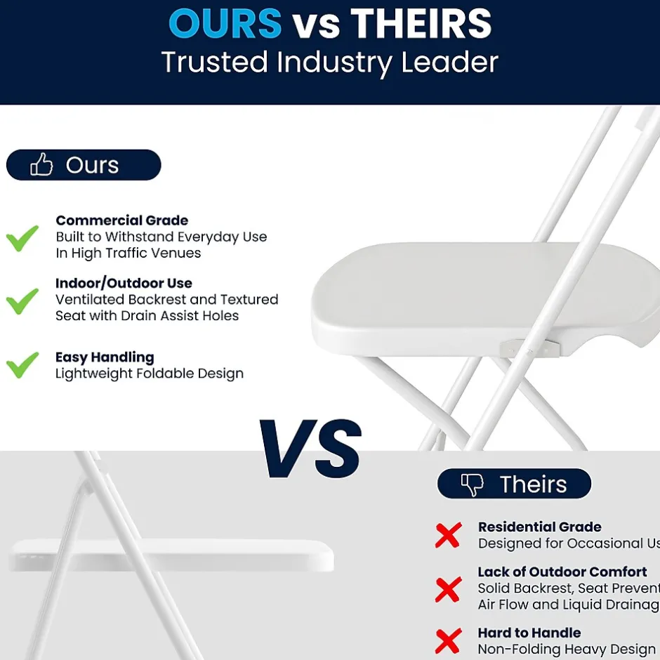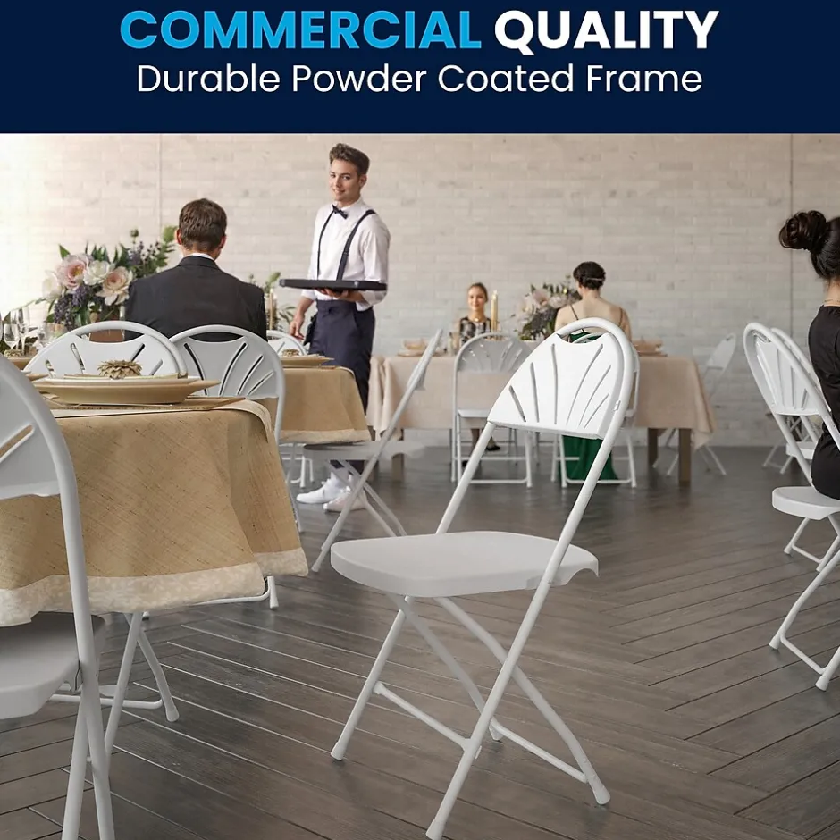 Flash Furniture HERCULES™ Series 800 lbs white folding chair sold as 40 per pack features powder finish thick steel frame and double rails for added strength. Non-marring caps protect floor from scratches. Easy to handle and stack.