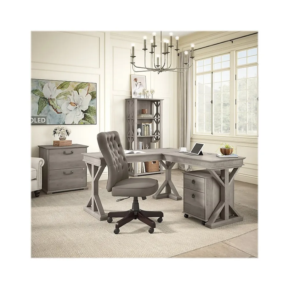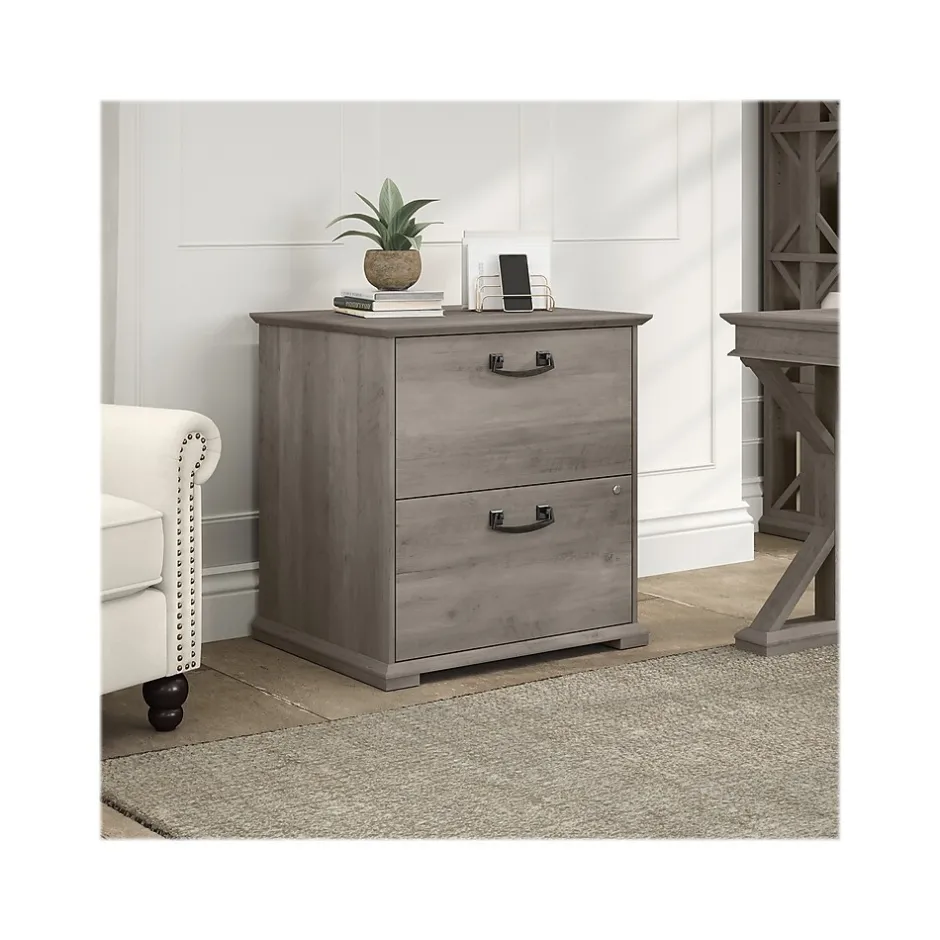 The Bush Furniture Homestead farmhouse-style lateral file cabinet offers a practical storage solution with an appealing modern farmhouse style. This filing cabinet utilizes Tip Guard safety features that include a stable design, a counterweighted back panel, wall attachment hardware, and safe-open drawers. Locking file cabinet’s drawers pull out one at a time for safe use and each support up to 50 lbs. Full-extension ball bearing slides provide easy-reach access to the letter-, legal-, and A4-size paperwork. A single lock secures both drawers for your privacy. Decorative trestle patterns, chamfered profile edges, and antique silver hardware give this cabinet a casual farmhouse style. This file cabinet has been tested to meet the ANSI/SOHO quality standards for safety and performance and is backed by a 1-year limited warranty. See the complete Homestead collection for more items.