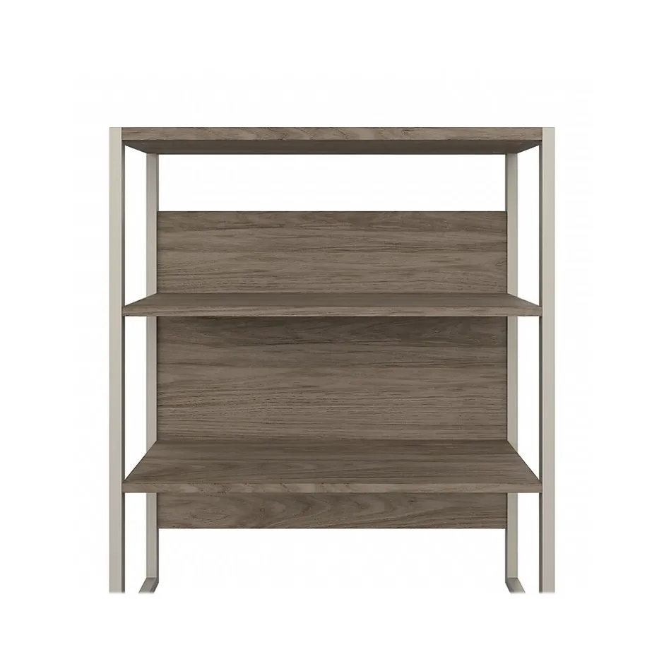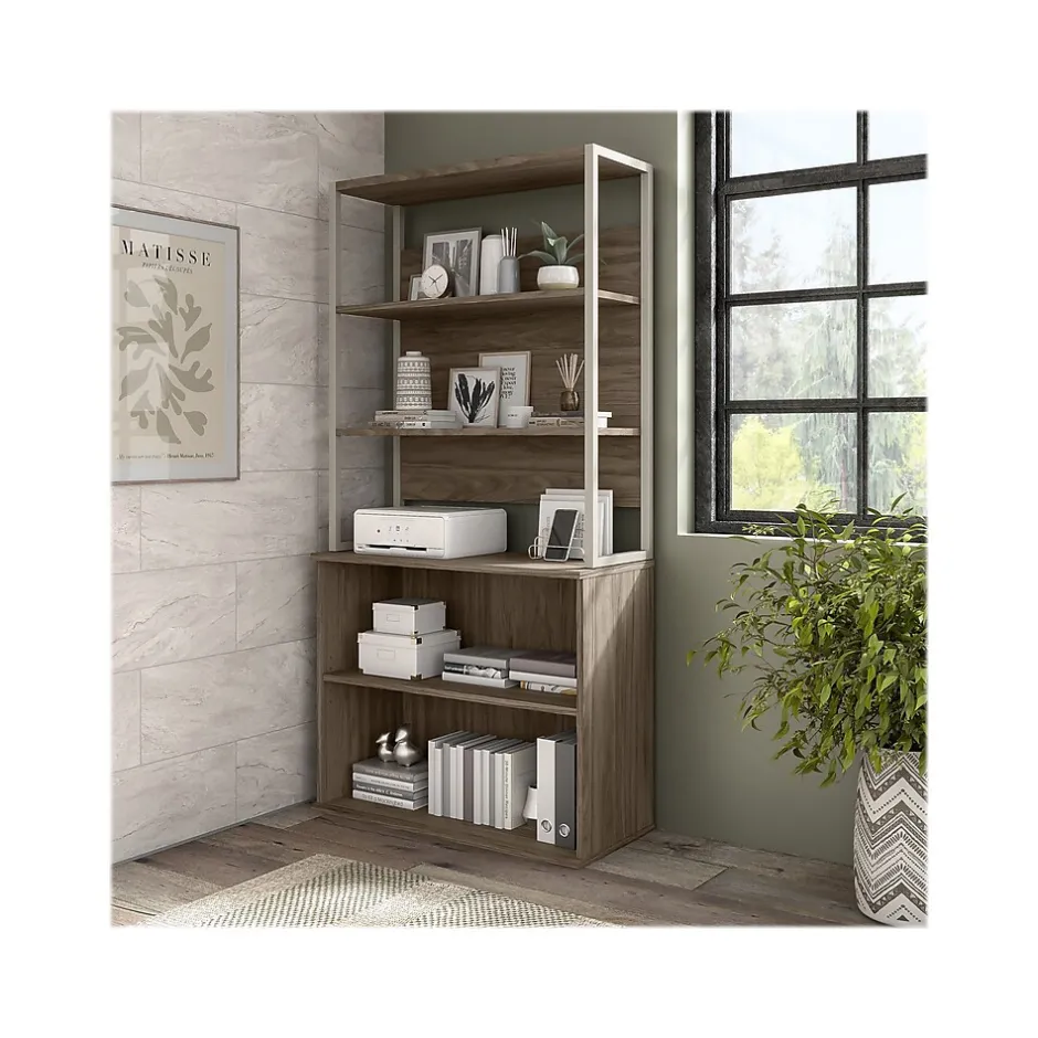 The Bush Business Furniture Hybrid tall etagere bookcase offers a stylish, long-lasting storage and display solution for the modern professional. Organize books and other reference materials, or decorate your workspace to give it a personal touch on shelves that support up to 50 lbs. each. The lower section contains one fixed shelf for stability and another that can be raised or lowered to accommodate items of various sizes. The open shelves are perfect for storing a small library or showcasing your favorite plants, pictures, and knickknacks. The tall bookcase’s stable design and included wall attachment hardware make it a safe choice for use in virtually any home or professional office environment. Find the perfect look for your space with five contemporary finish options: black walnut, modern hickory, platinum gray, storm gray, and white. This five-shelf bookcase has been meticulously tested to meet or exceed ANSI/BIFMA quality standards for safety, durability, and performance and is backed by the Bush Business Furniture 10-year manufacturer warranty. See the full Bush Business Furniture Hybrid collection for coordinating items to enhance your workspace as needed, including computer desks, file cabinets, and storage cabinets (coordinating items sold separately). American-made with US and imported parts.