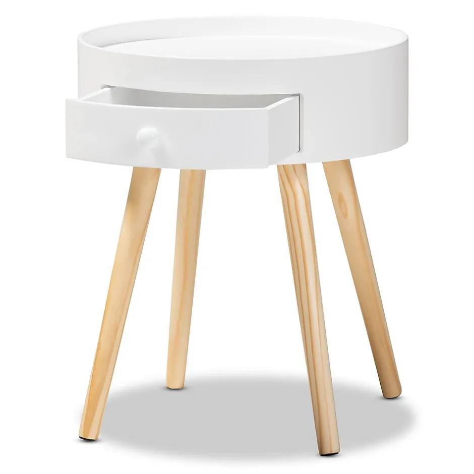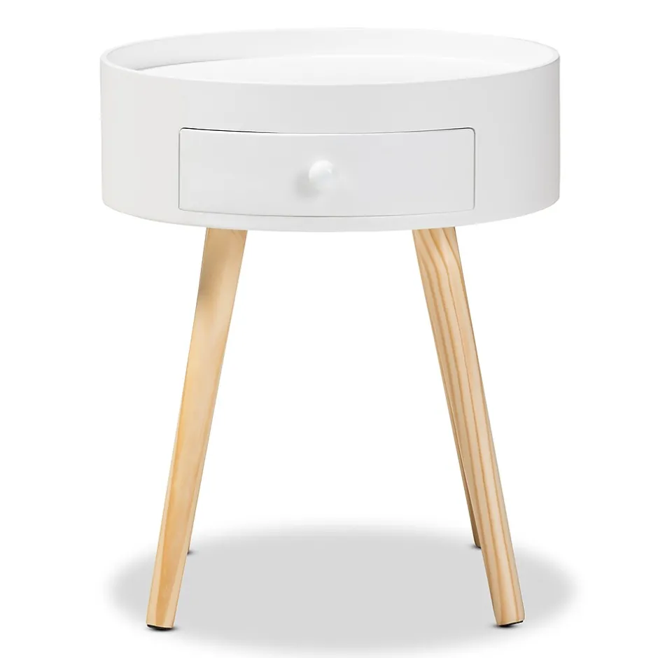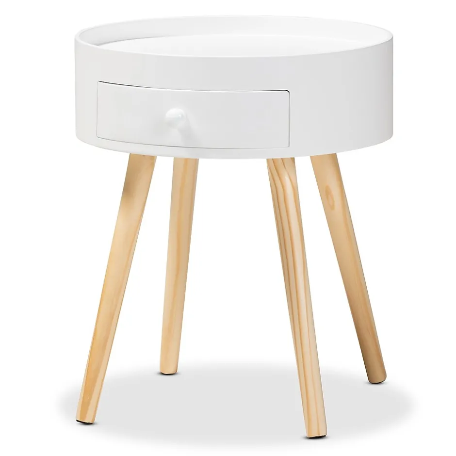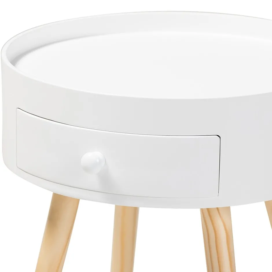 Add cool, quirky style to your bedroom with the Jessen nightstand. The Jessen features a tray-style top, ideal for keeping phones and other items secure. One drawer, fitted with a round knob, provides space to store bedside essentials. Functional and stylish, the Jessen showcases a sleek neutral finish that is complimentary to a wide range of color palettes. Angled wood legs add a stylish mid-century feel. The Jessen nightstand is made in China and requires assembly.