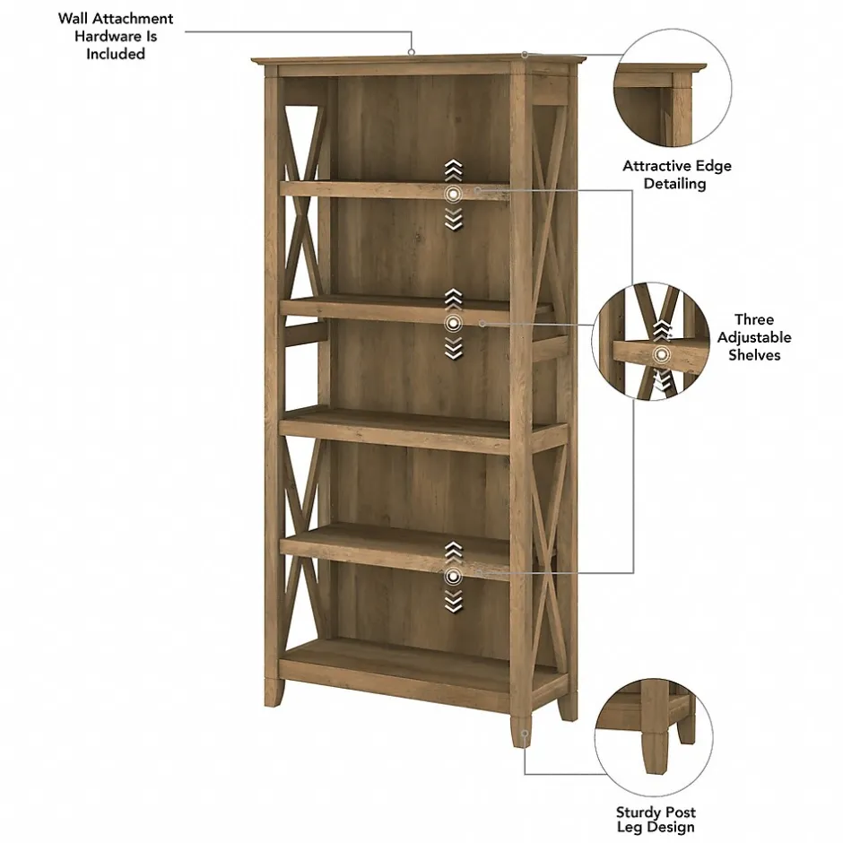 The Bush Furniture Key West tall five-shelf bookcase set is a perfect way to show off your favorite artwork, photos, plants, and more. These matching bookcases each include three adjustable shelves to accommodate items of various sizes and two fixed shelves for stability. Each shelf supports up to 50 lbs. so you can store your collection of paperback and hardcover books or display decorations with confidence. Place the tall bookshelf set side by side to create a storage wall or position them separately based on the needs of your space. Stylish touches include X-pattern accents on the side panels as well as a sturdy and attractive post-leg design. Wall attachment hardware is included for family-friendly safety and security in any home office or living room. These five-shelf bookcases are tested to meet ANSI/SOHO quality standards for safety and performance and are backed by a 1-year manufacturer warranty.