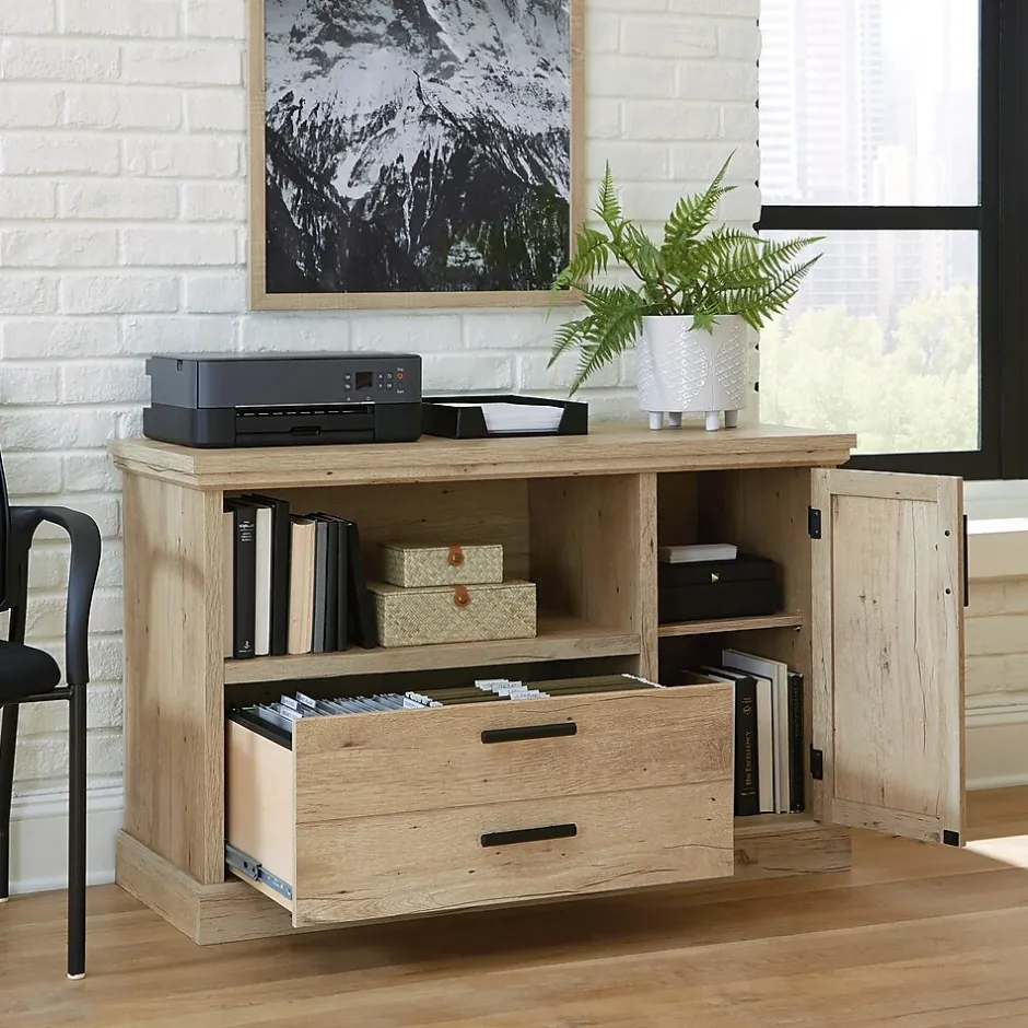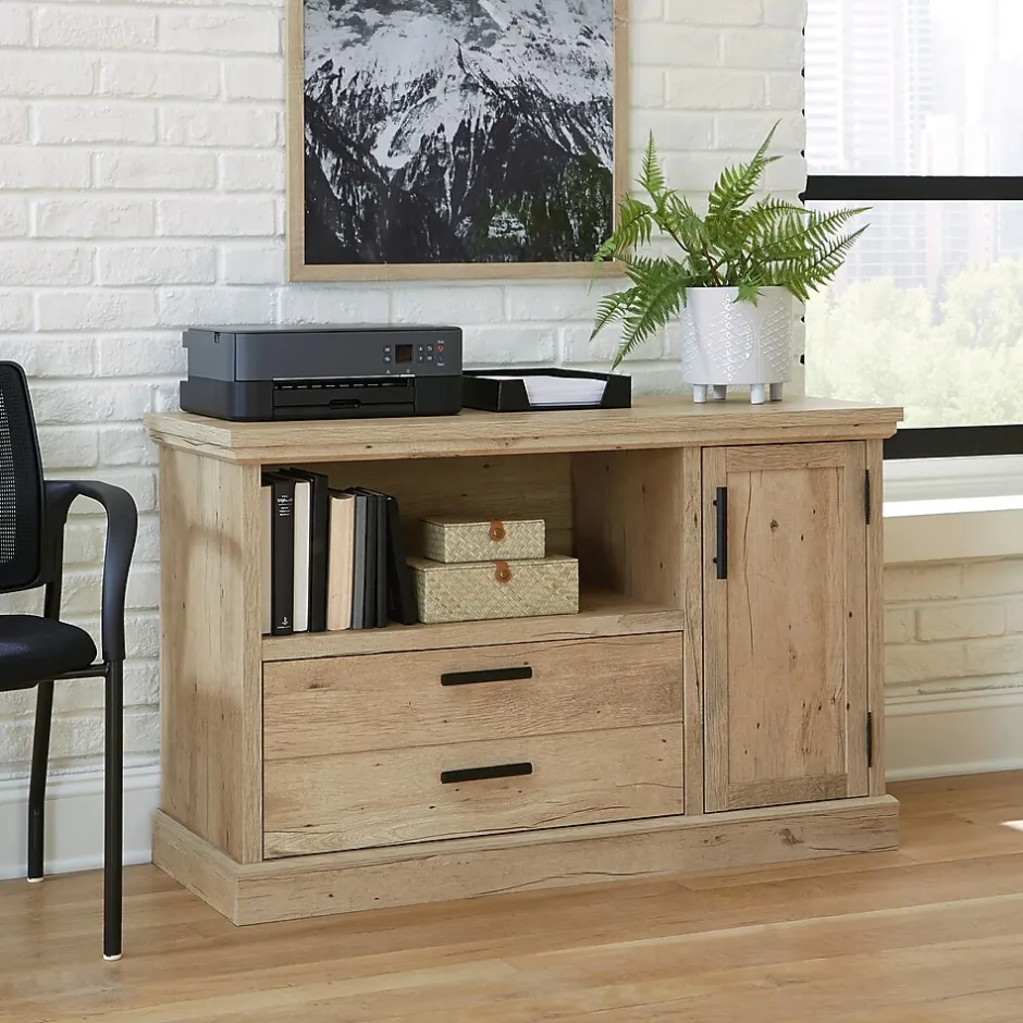 A multipurpose file credenza, like this one from the Mason Peak collection, allows the highest level of configurability and storage options to give you the office space you’ve always dreamed of. The top of this office storage credenza features a strong and lightweight 1″ panel constructionmeaning, it is perfect for your heavier office essentials while remaining easy to assemble and rearrange. A melamine surface makes the top of this office storage cabinet resistant to heat, stains, and scratches. This storage credenza features an adjustable shelf behind the door located on the right side. The adjustable shelf allows you to modify the file cabinet to accommodate items of various heights. Don’t forget the hanging files! A piece of commercial office furniture would not be complete without a file drawer with full extension slides that holds letter or legal-size hanging files. This keeps your documents organized and easy to locate. Finished in a Prime Oak and featuring attractive hardware, this resimercial file credenza adds an interesting look and optimal storage solutions to your office.